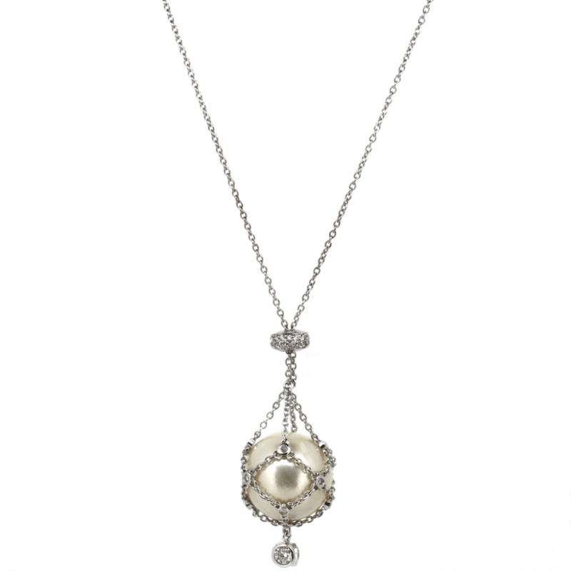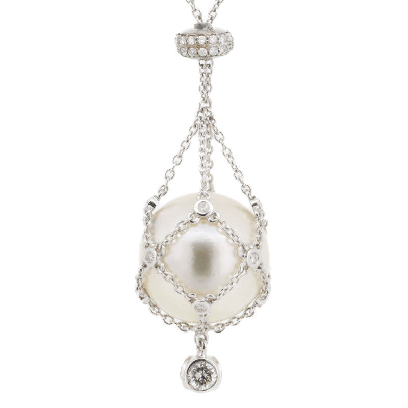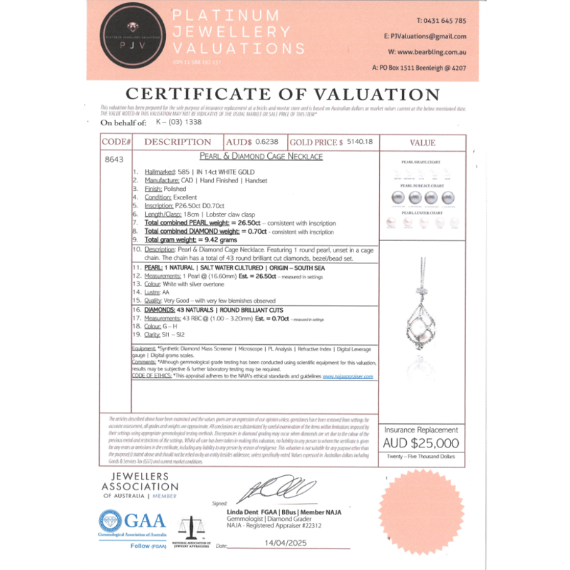 14K WHITE GOLD, WHITE CULTURED SOUTH SEA PEARL AND DIAMOND, CAGE NECKLACE. THE DESIGN FEATURES ONE ROUND, WHITE WITH SILVER OVERTONES, CULTURED SOUTH SEA PEARL (26.50CT, 16.60MM SIZE, GOOD LUSTRE, NATURAL GROWTH MARKS), UNSET IN A "CAGE" CHAIN. THE CHAIN FEATURES 43 ROUND BRILLIANT CUT DIAMONDS (0.70CT TDW, G-H COLOUR, SI1-SI2 CLARITY, 1.00-3.20MM) AND A BEZEL/BEAD SET. THE NECKLACE FEATURES A LOBSTER CLAW CLASP CLOSURE. NECKLACE LENGTH IS 18CM. Valuations Provided by an Independent Third-Party Professional Not Directly Associated With Lloyds Auctions at AUD $25,000.00This valuation has been conducted by an independent third-party professional. The valuation amount is an assessment by the issuing valuer and does not reflect the auction value of the item. Any inquiries regarding the valuation should be directed to the issuing valuer (refer to contact details on the certificate), as Lloyds Auctions has no affiliation or influence over the valuation, the valuer, or the stated amount. Condition: Good - Refer Images 0645880+299