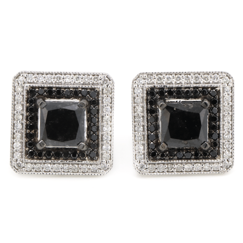14K WHITE GOLD, BLACK DIAMOND AND DIAMOND, DOUBLE HALO EARRINGS. THE CENTRES FEATURE, 2 PRINCESS CUT, BLACK, DIAMONDS (2.59CT TDW, OPAQUE), 4 CLAW SET. SURROUNDING THE CENTRE IN THE INNERMOST HALO ARE, 56 ROUND BRILLIANT CUT, BLACK, DIAMONDS (0.34CT TDW, OPAQUE), BEAD SET. SURROUNDING THE CENTRE IN THE OUTERMOST HALO ARE, 72 ROUND BRILLIANT CUT, DIAMONDS (0.37CT TDW, H-K COLOUR, SI-I2+ CLARITY), BEAD SET. THE EARRINGS FEATURE BUTTERFLY CLASPS. Valuations Provided by an Independent Third-Party Professional Not Directly Associated With Lloyds Auctions at AUD $15,000.00This valuation has been conducted by an independent third-party professional. The valuation amount is an assessment by the issuing valuer and does not reflect the auction value of the item. Any inquiries regarding the valuation should be directed to the issuing valuer (refer to contact details on the certificate), as Lloyds Auctions has no affiliation or influence over the valuation, the valuer, or the stated amount. Condition: Good - Refer Images 0645880+207
