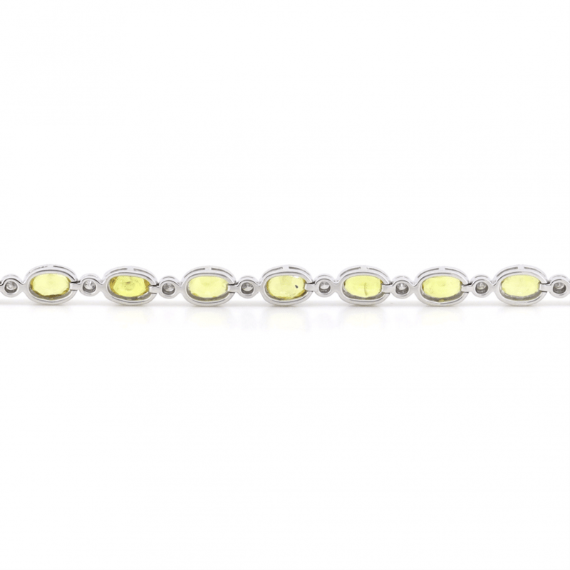 14K WHITE GOLD, 8.08CT TSW YELLOW CEYLON SAPPHIRE AND DIAMOND, LINE BRACELET. THE BRACELET FEATURES, 16 OVAL CUT, MODERATE YELLOW-GOLDEN MIX, CEYLON SAPPHIRES (8.08CT TSW, SLIGHTLY INCLUDED, ENHANCED), BEZEL SET. ALTERNATING BETWEEN ARE, 16 ROUND BRILLIANT CUT, DIAMONDS (0.53CT TDW, G-K COLOUR, P1+ CLARITY), BEZEL SET. THE BRACELET HAS A LOBSTER CLAW CLASP. BRACELET LENGTH IS 17CM. Valuations Provided by an Independent Third-Party Professional Not Directly Associated With Lloyds Auctions at AUD $16,400.00This valuation has been conducted by an independent third-party professional. The valuation amount is an assessment by the issuing valuer and does not reflect the auction value of the item. Any inquiries regarding the valuation should be directed to the issuing valuer (refer to contact details on the certificate), as Lloyds Auctions has no affiliation or influence over the valuation, the valuer, or the stated amount. Condition: Good - Refer Images 0645880+258