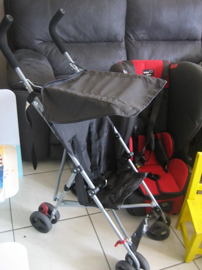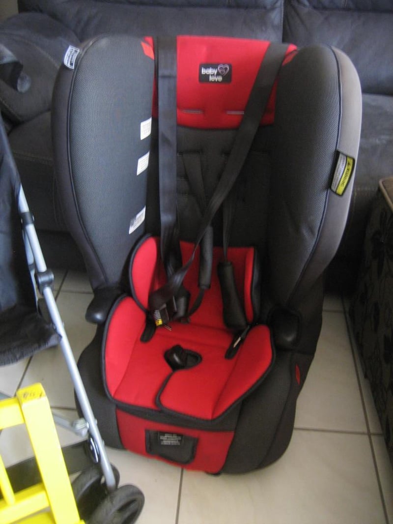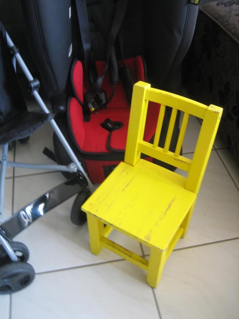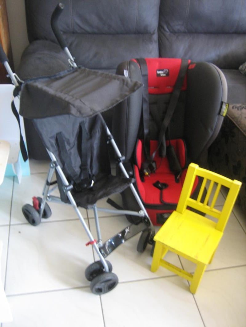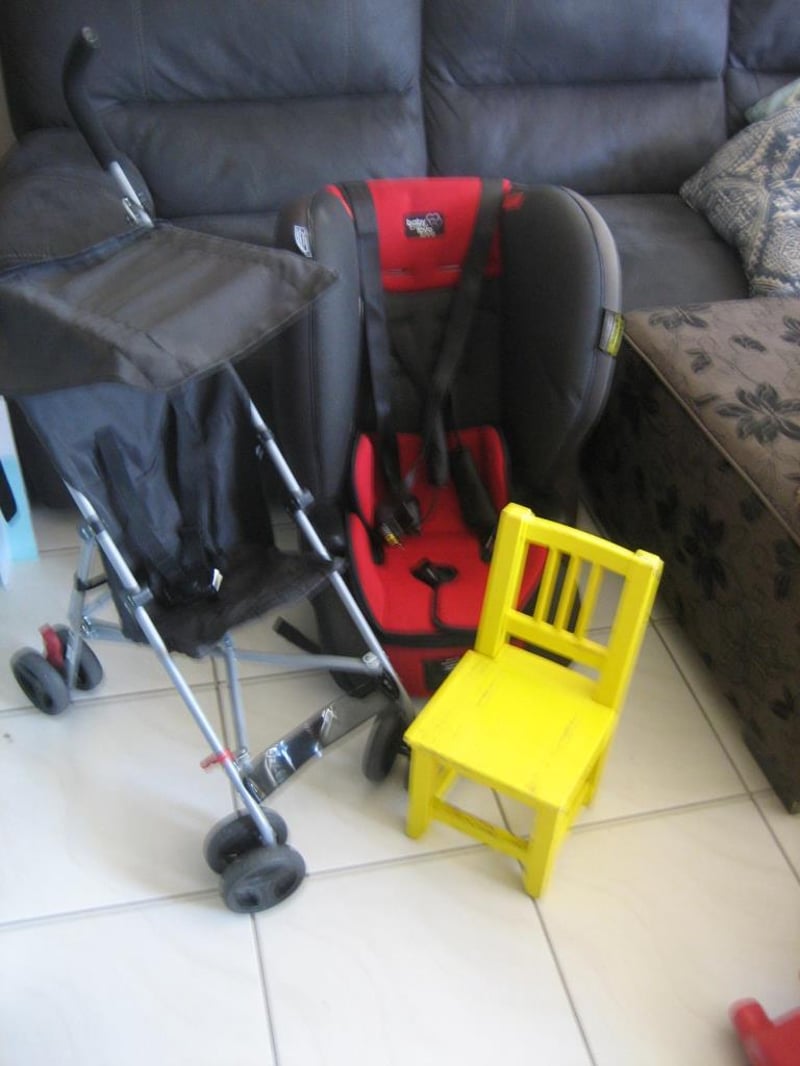 Set of child accessories including stroller/buggy, baby love car seat (12mnths-6 yrs), yellow timber kids chair.
