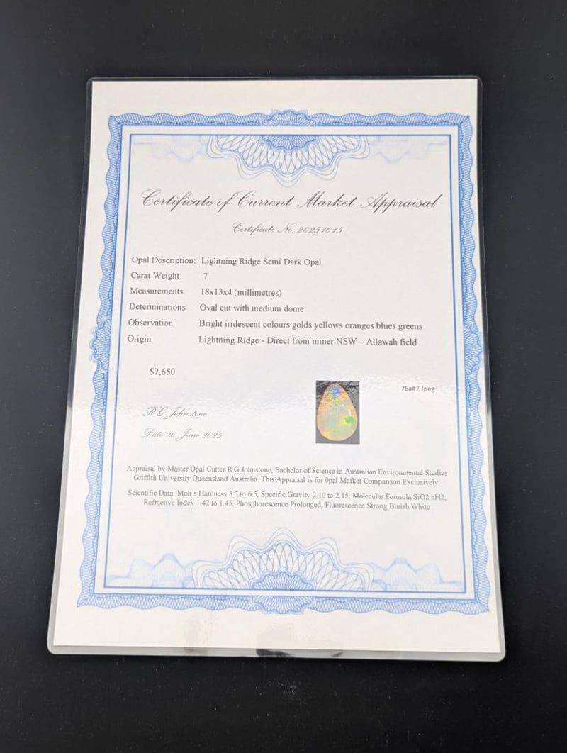 7 CARATS LIGHTNING RIDGE SEMI DARK OPAL. Good Bright Colour. 18X13X4 Valuations Provided by an Independent Third-Party Professional Not Directly Associated With Lloyds Auctions at AUD $2650This valuation has been conducted by an independent third-party professional. The valuation amount is an assessment by the issuing valuer and does not reflect the auction value of the item. Any inquiries regarding the valuation should be directed to the issuing valuer (refer to contact details on the certificate), as Lloyds Auctions has no affiliation or influence over the valuation, the valuer, or the stated amount. 0996907+78
