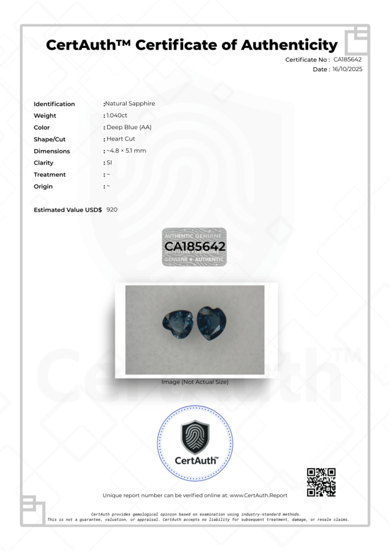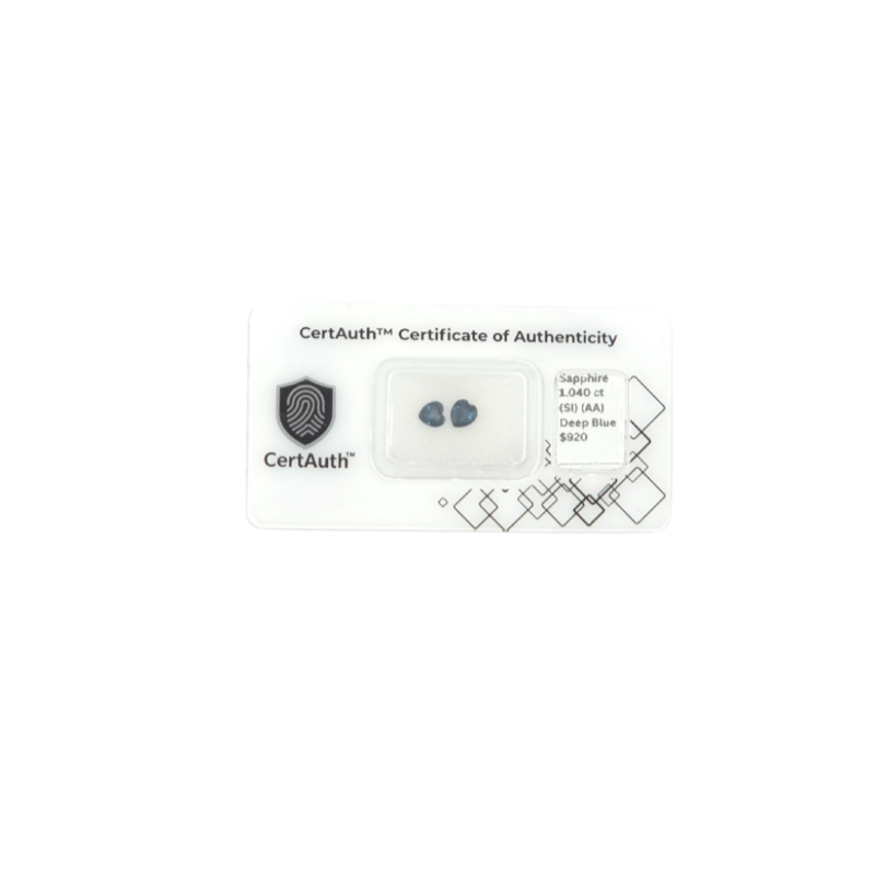 Certified Matching Pair Of Natural Deep Blue Sapphires Weighing A Combined 1.04Ct. Each Gem Is Heart Cut, Graded Aa For Colour With Attractive Si Clarity And Rich Saturation. Professionally Authenticated And Sealed In A Certauth™ Tamper-Evident Card, Certificate No. Ca185642.