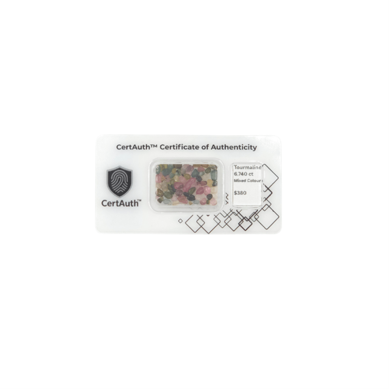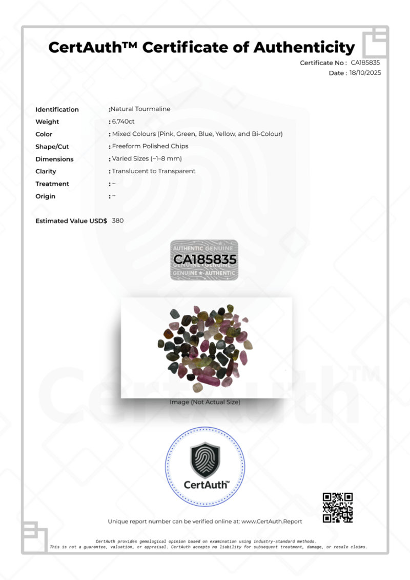 6.74CT NATURAL TOURMALINE PARCEL – MIXED COLOURS, FREEFORM CHIPS, CERTAUTH™ SECURE CARD Certified 6.74Ct Parcel Of Natural Tourmaline In Mixed Colours Including Pink, Green, Blue, Yellow, And Bi-Colour Tones. Each Freeform Polished Chip Ranges Between ~1–8 Mm, Displaying Translucent To Transparent Clarity. Sealed In A Tamper-Evident Certauth™ Authentication Card, Certificate No. Ca185835.Details:• Gemstone: Natural Tourmaline• Weight: 6.740 Ct• Dimensions: Varied Sizes (~1–8 Mm)• Colour: Mixed (Pink, Green, Blue, Yellow, Bi-Colour)• Clarity: Translucent – Transparent• Cut: Freeform Polished Chips• Treatment: ~• Origin: ~• Certification: Certauth™ Ca185835 (Secure Card) Condition: Good - Refer Images 0488303+CA185835
