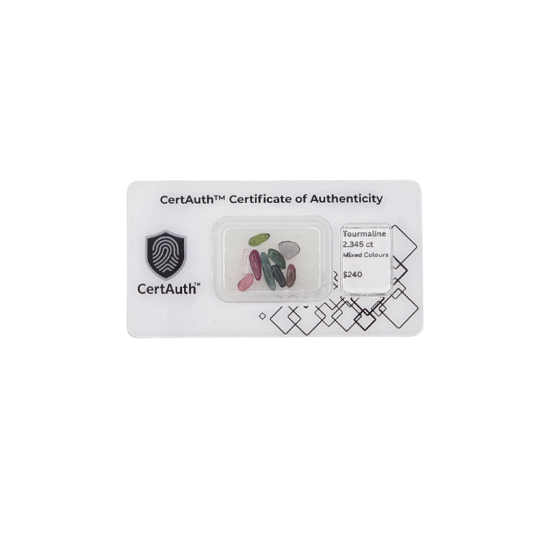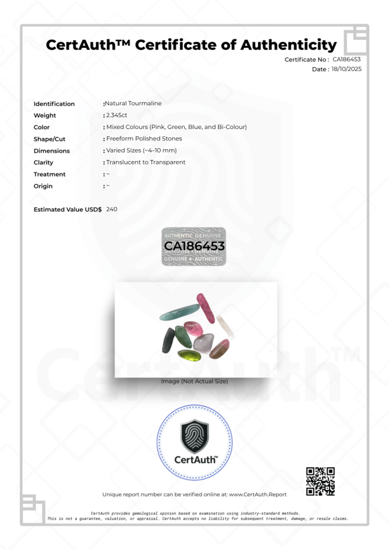 2.35CT NATURAL TOURMALINE PARCEL – MIXED COLOURS, FREEFORM STONES, CERTAUTH™ SECURE CARD Certified 2.35Ct Parcel Of Natural Tourmaline Featuring Mixed Pink, Green, Blue, And Bi-Colour Tones. Each Polished Freeform Stone Ranges From Approximately 4–10 Mm With Translucent To Transparent Clarity. Sealed In A Tamper-Evident Certauth™ Authentication Card, Certificate No. Ca186453.Details:• Gemstone: Natural Tourmaline (Parcel)• Weight: 2.345 Ct• Dimensions: Varied Sizes (~4–10 Mm)• Colour: Mixed (Pink, Green, Blue, Bi-Colour)• Clarity: Translucent To Transparent• Cut: Freeform Polished Stones• Treatment: ~• Origin: ~• Certification: Certauth™ Ca186453 (Secure Card) Condition: Good - Refer Images 0488303+CA186453