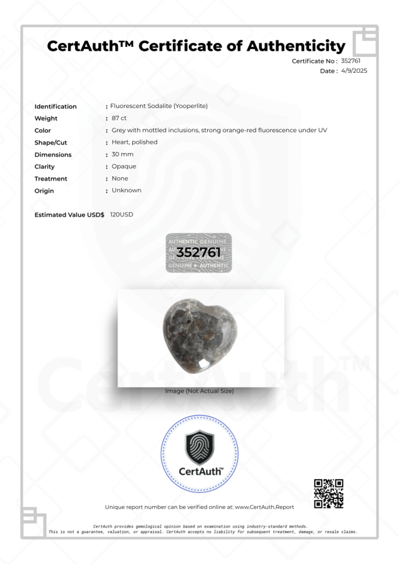 87CT FLUORESCENT SODALITE (YOOPERLITE) – HEART CUT, 30MM, CERTAUTH™ 352761 Certified 87Ct Fluorescent Sodalite, Also Known As Yooperlite, Polished Into A Heart Shape. Exhibits A Mottled Grey Appearance With Strong Orange-Red Fluorescence When Exposed To Uv Light. A Unique Collector’S Specimen Combining Natural Beauty And Luminescent Effect.Details:• Gemstone: Fluorescent Sodalite (Yooperlite)• Weight: 87Ct• Colour: Grey With Mottled Inclusions, Strong Orange-Red Uv Fluorescence• Cut: Heart, Polished• Dimensions: ~30Mm• Clarity: Opaque• Treatment: None• Origin: Unknown• Certification: Certauth™ 352761• Estimated Value: Usd $120 Condition: Good - Refer Images 0488303+352761
