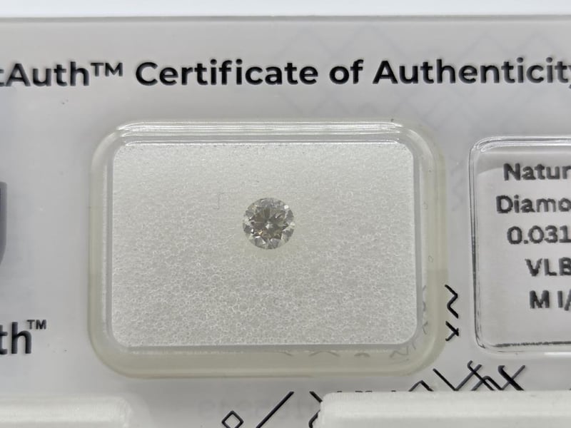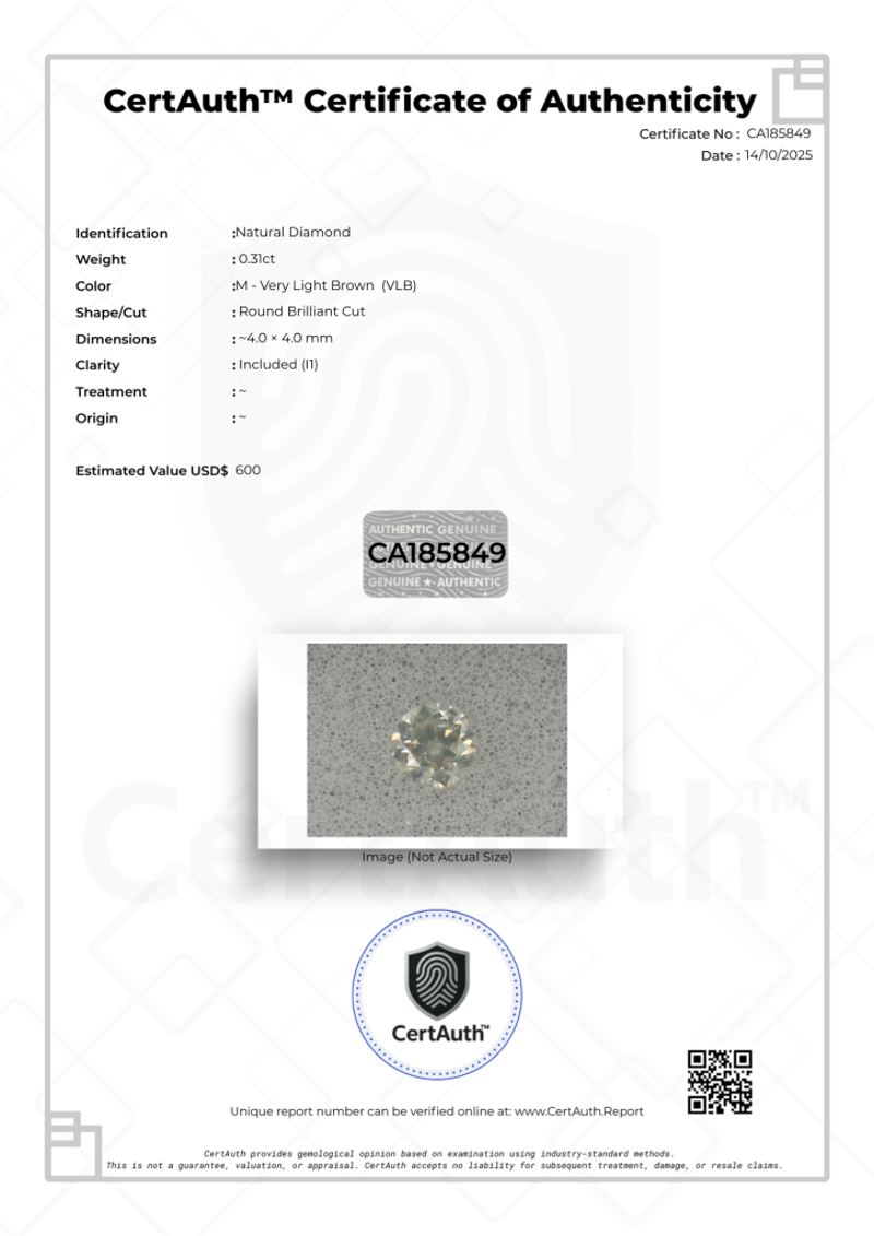 Certified 0.31Ct Natural Diamond Featuring M Colour (Very Light Brown) And A Classic Round Brilliant Cut. Eye-Visible Inclusions Typical Of I1 Clarity; Excellent Sparkle For Jewellery Use.