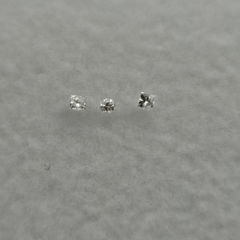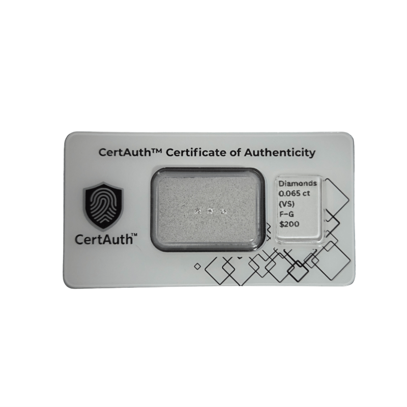 Certified Trio Of Natural Diamonds Totalling 0.065Ct, Featuring A Mix Of Round And Princess Cuts. Each Diamond Shows Exceptional Brilliance With F–G Colour And Vs Clarity. Professionally Authenticated And Sealed In A Certauth™ Tamper-Evident Card, Certificate No. Ca185777.