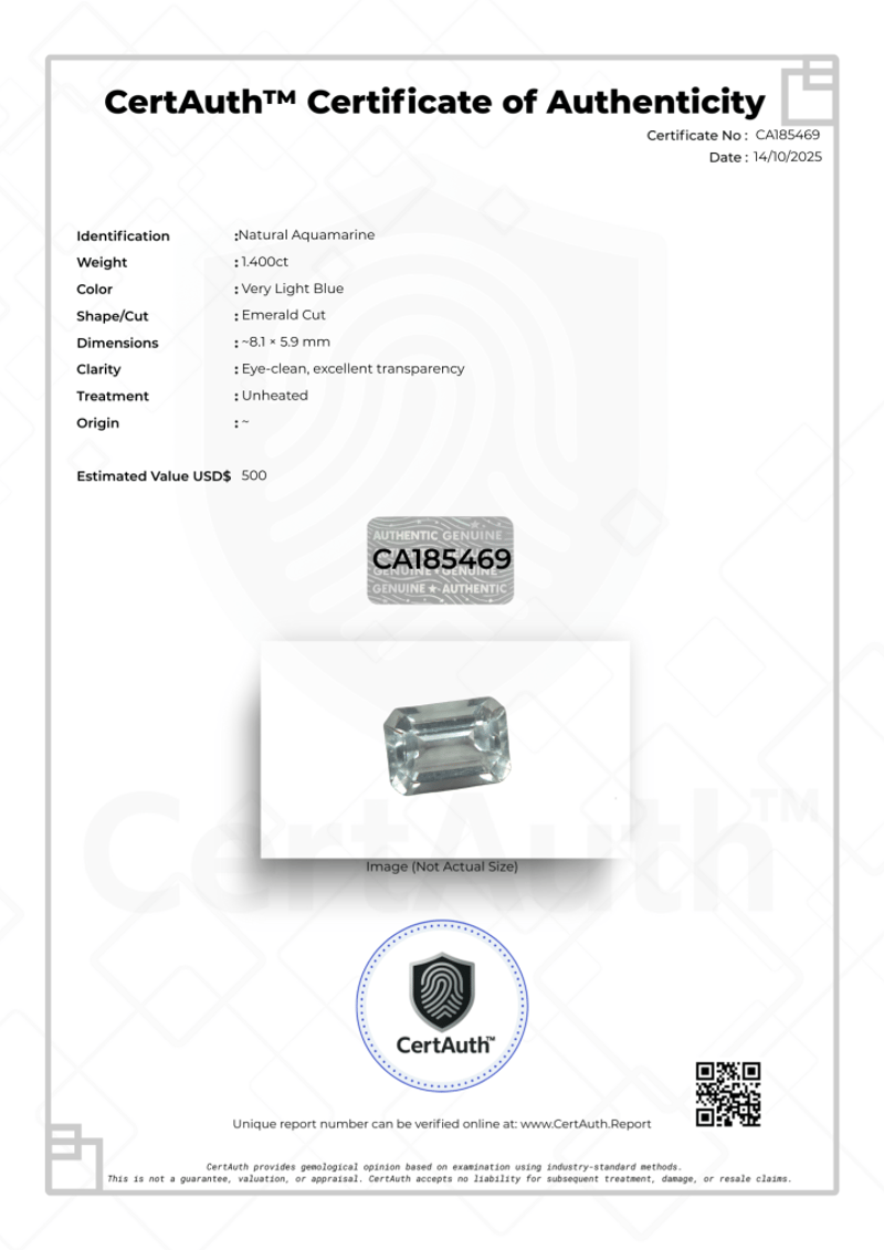 1.400CT NATURAL AQUAMARINE – VERY LIGHT BLUE, EMERALD CUT, UNHEATED, CA185469 Certified 1.400Ct Natural Aquamarine With Very Light Blue Colour And Excellent Transparency. Presented In A Precision Emerald Cut And Unheated, Showing Exceptional Clarity And Brilliance.Details:• Gemstone: Natural Aquamarine• Carat Weight: 1.400Ct• Colour: Very Light Blue• Cut: Emerald Cut• Dimensions: ~8.1 × 5.9 Mm• Clarity: Eye-Clean, Excellent Transparency• Treatment: Unheated• Certification: Ca185469Condition:Loose, Unmounted And Professionally Assessed. Ready To Be Set. Condition: Good - Refer Images 0488303+CA185469