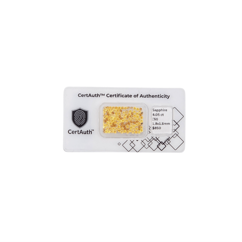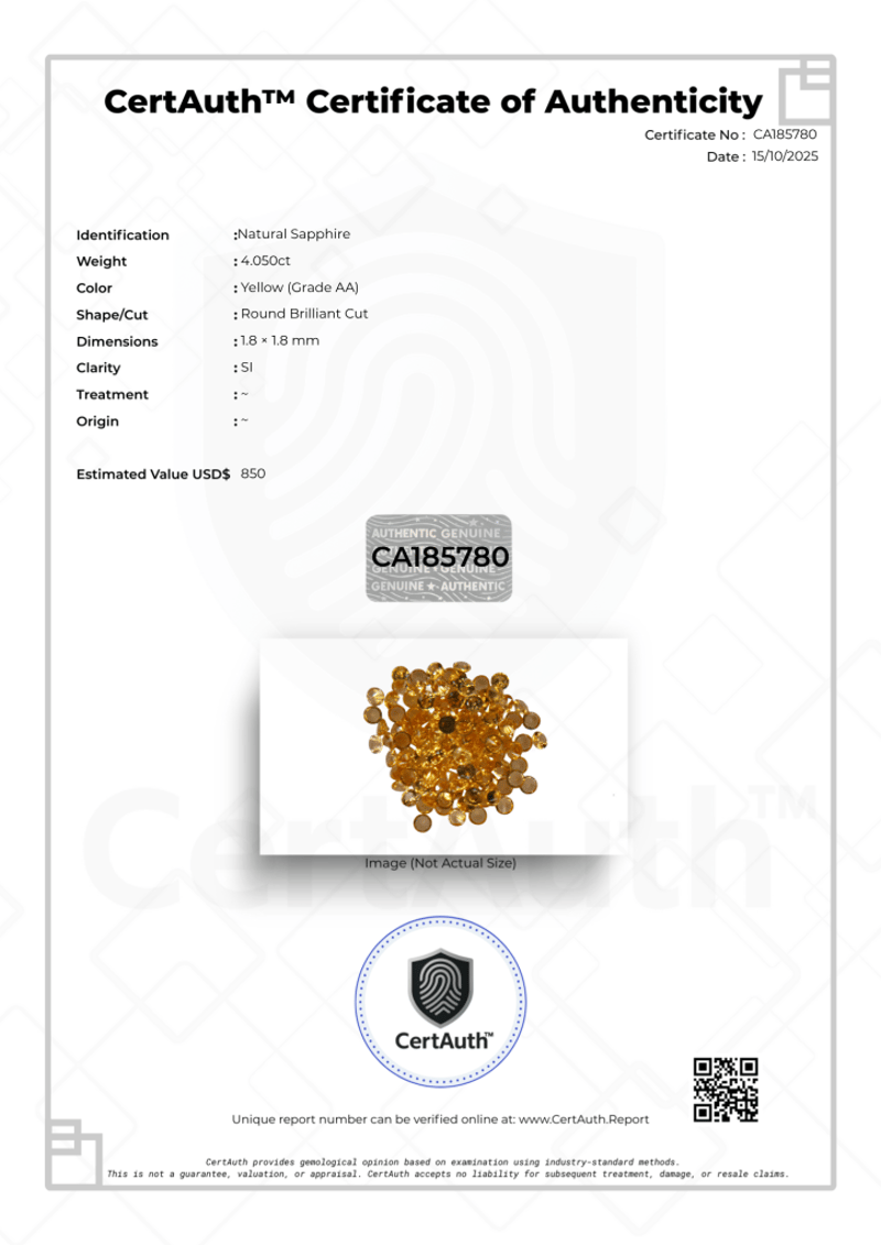 4.05CT NATURAL YELLOW SAPPHIRE PARCEL – ROUND BRILLIANT CUT, CERTAUTH™ SECURE CARD Certified 4.05Ct Parcel Of Natural Yellow Sapphires In Uniform 1.8 Mm Round Brilliant Cuts. Each Stone Is Grade Aa In Colour With Si Clarity, Offering Bright Golden Tones And Excellent Sparkle. Professionally Authenticated And Sealed In A Certauth™ Tamper-Evident Card, Certificate No. Ca185780.Details:• Gemstone: Natural Sapphire (Parcel)• Weight: 4.05 Ct Total• Dimensions: 1.8 × 1.8 Mm Each• Colour: Yellow (Grade Aa)• Clarity: Si• Cut: Round Brilliant• Treatment: ~• Origin: ~• Certification: Certauth™ Ca185780 (Secure Card) Condition: Good - Refer Images 0488303+CA185780