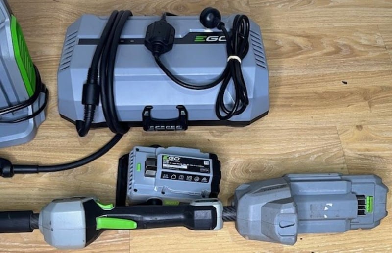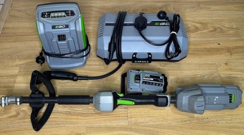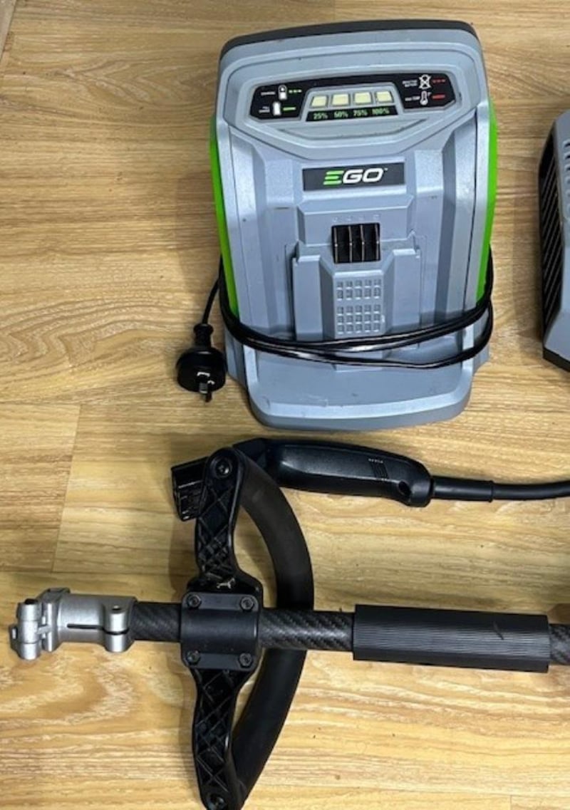 Cordless EGO 56V garden tools. 1 x power head base, 1 x PAD1500E inverter, 1 x CH5500E charger, 1 x CHV1600E power and charger. Skins only, no batteries. Condition: Not working, untested, for parts or repair.