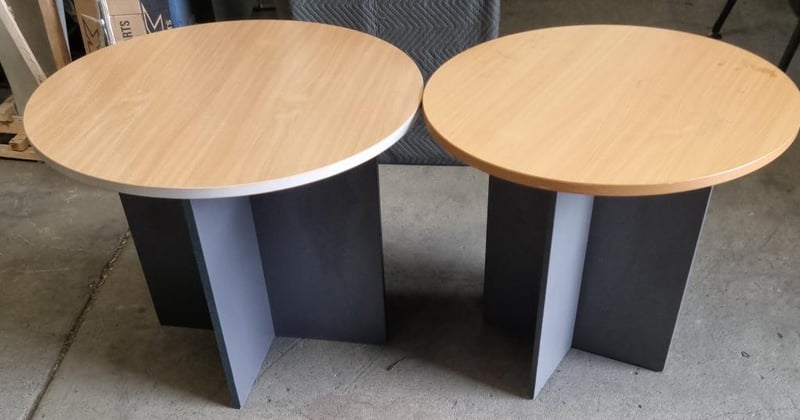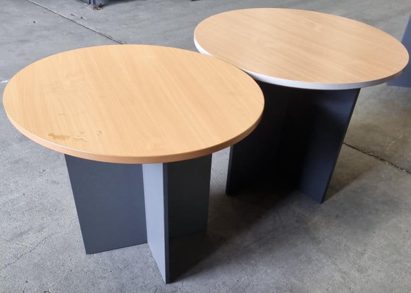 Office furniture includes, two round tables.Table dims: 74 x 100 x 100NOTE: Signs of wear and tear.Sold as a lot.