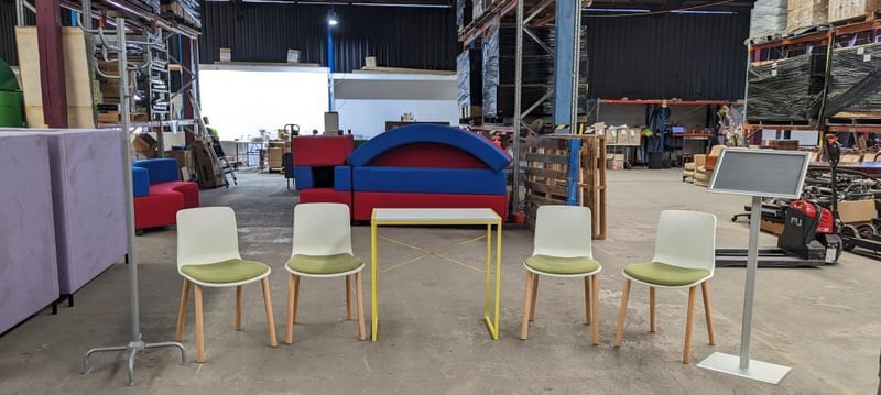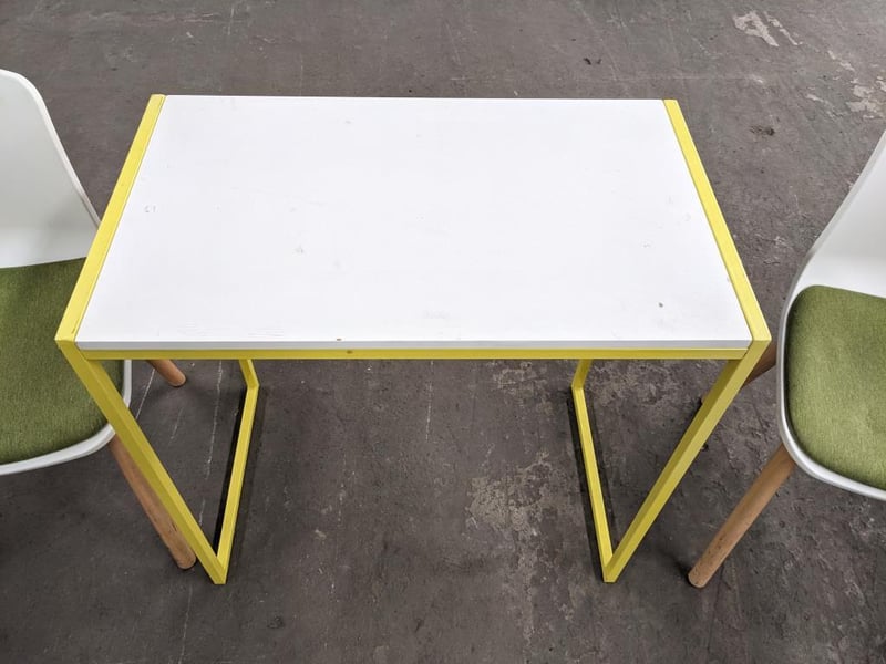 Assorted furniture includes, white table, white and green chairs and more... Table dims: 76 x 78 x 46 Chair dims: 73 x 48 x 46 NOTE: Signs of wear and tear. Sold as a lot.