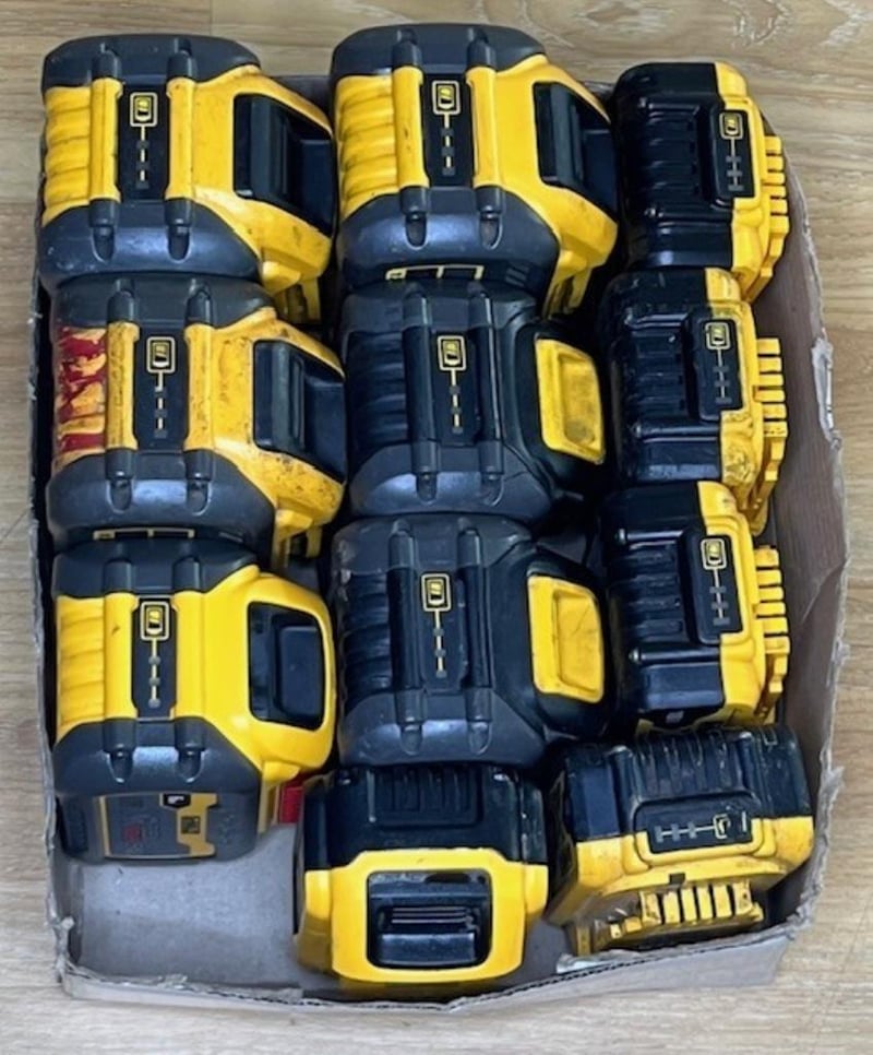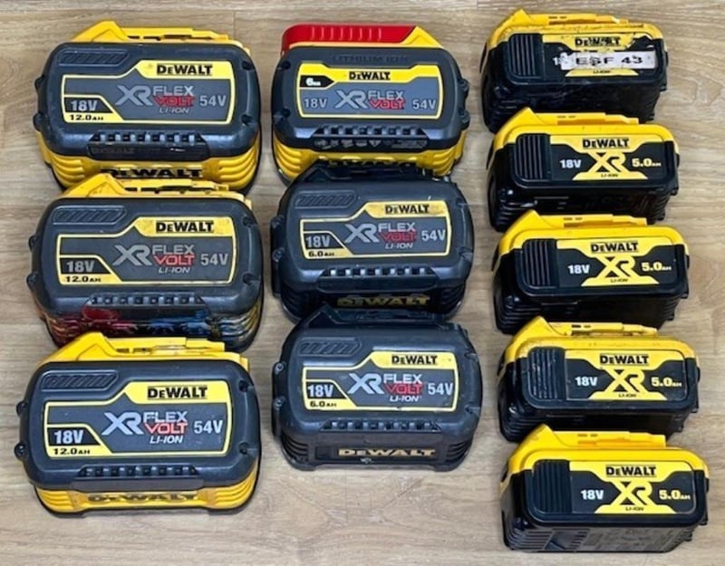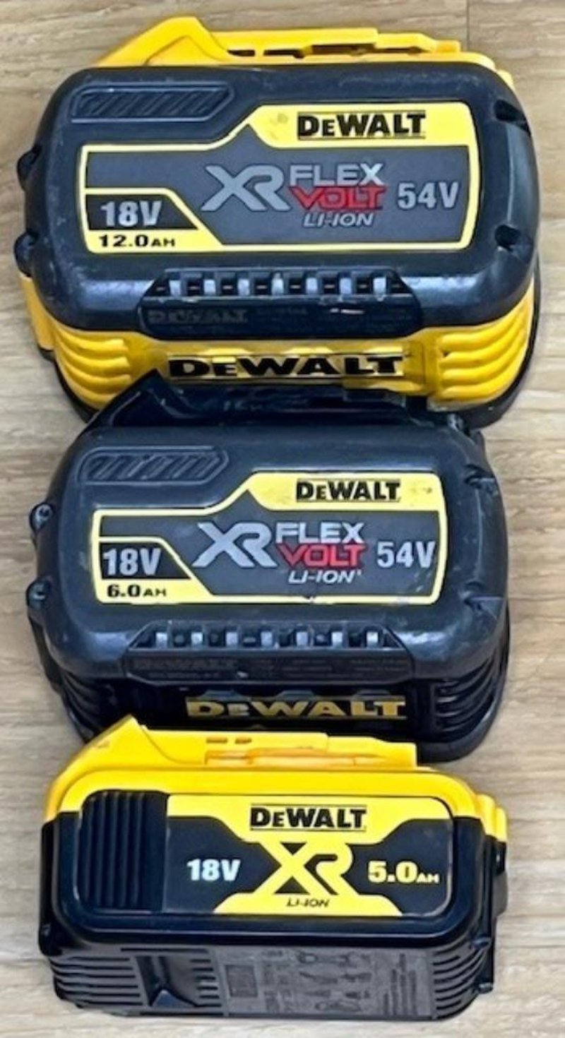 DeWalt batteries, 3 x XR FlexVolt 12Ah 18V/54V, 3 x XR FlexVolt 6Ah 18V/54V, 5 x XR 5Ah 18V. Condition: All showing no charge. Not working, untested, for parts or repair.