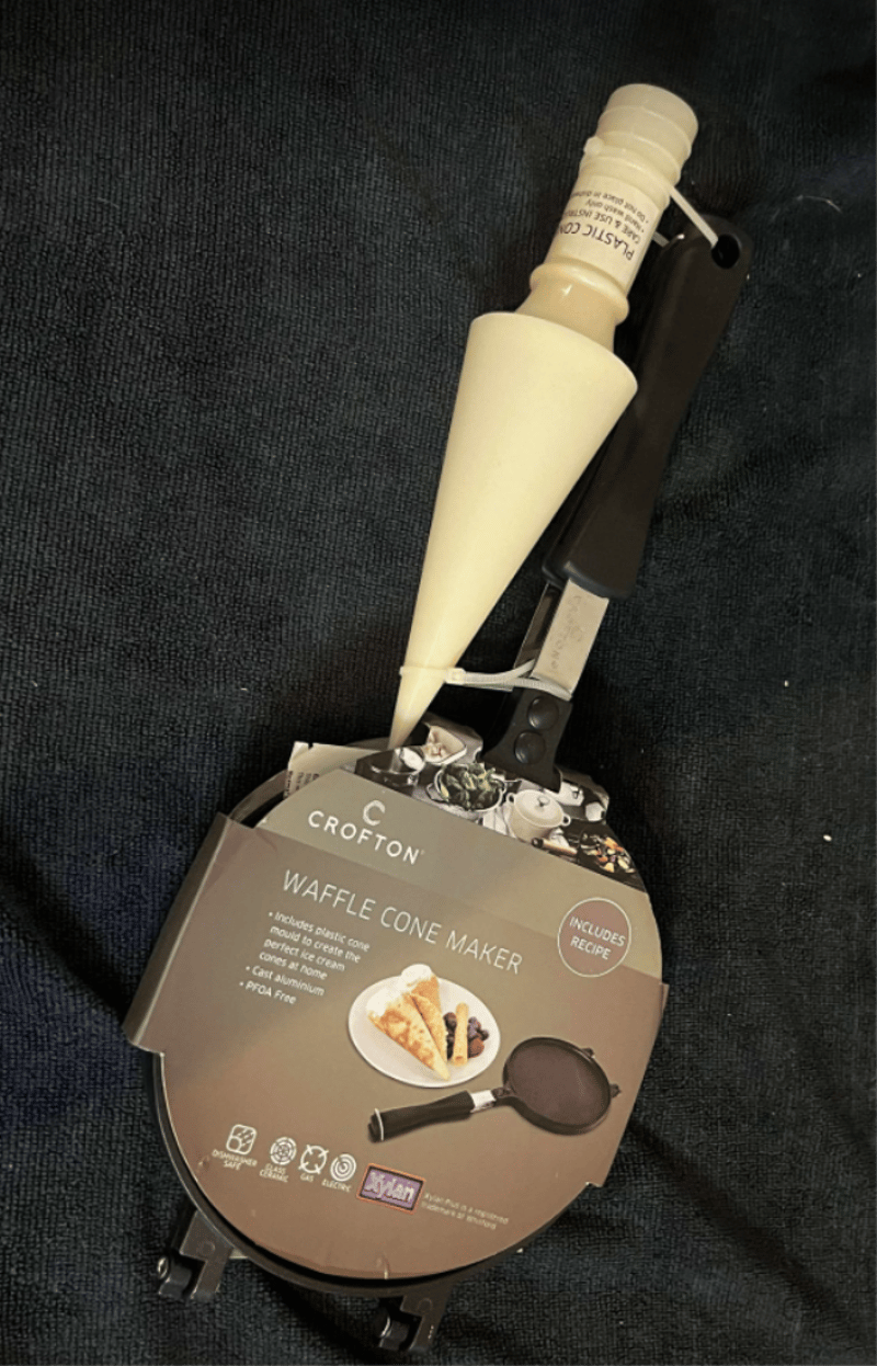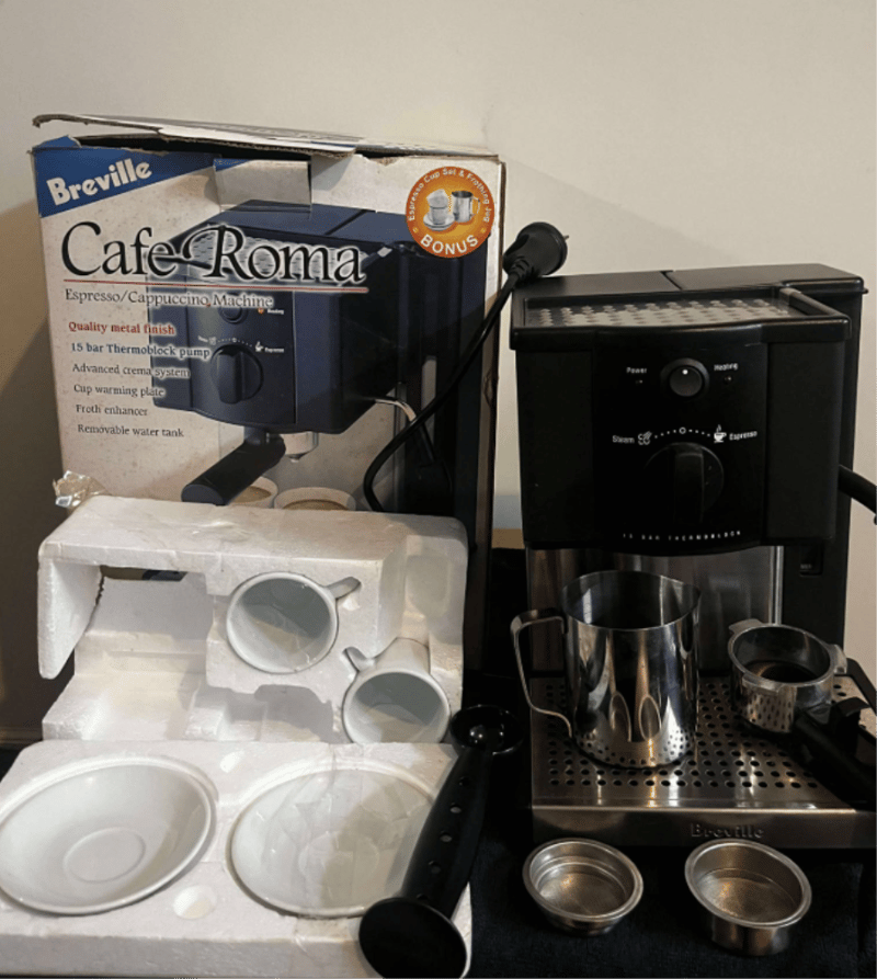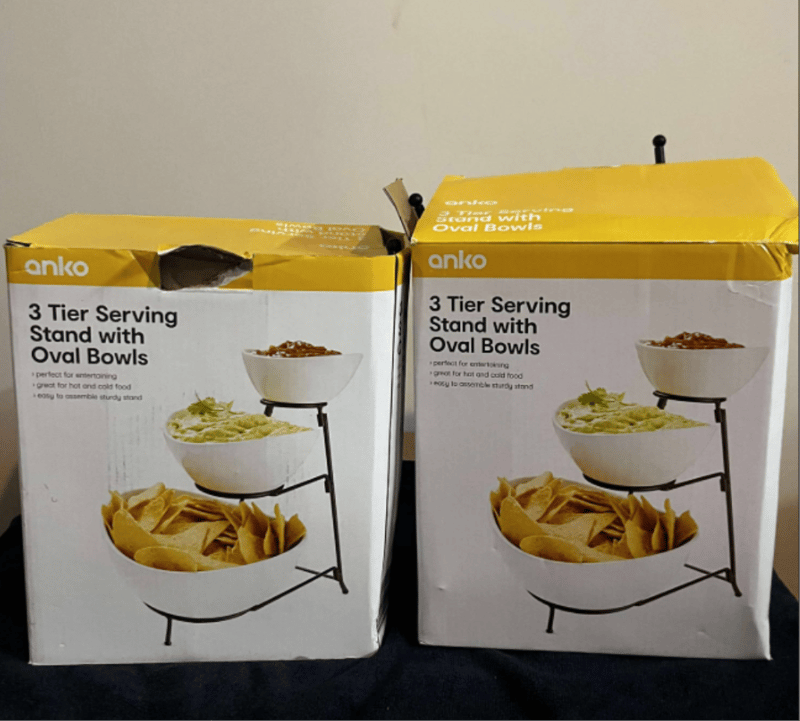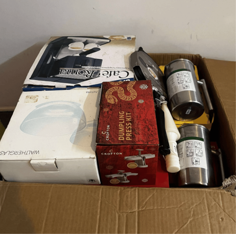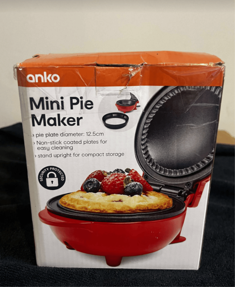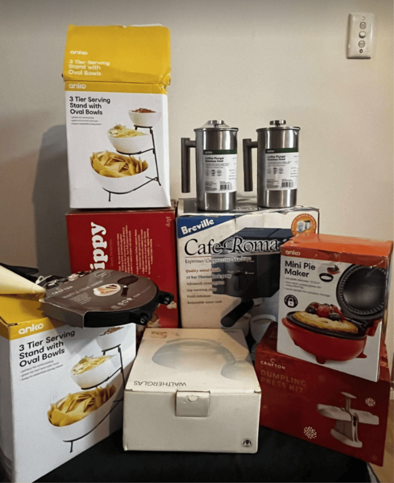 Kitchen Box – Mixed Items.(Breville Coffee machine, Mini Zippy, dumpling Press, Mini pie maker, 2 x 3 tier severing stand with oval bowls, waltherglas german Christmas bowl, waffle cone maker, 2 coffee plunger stainless steel.