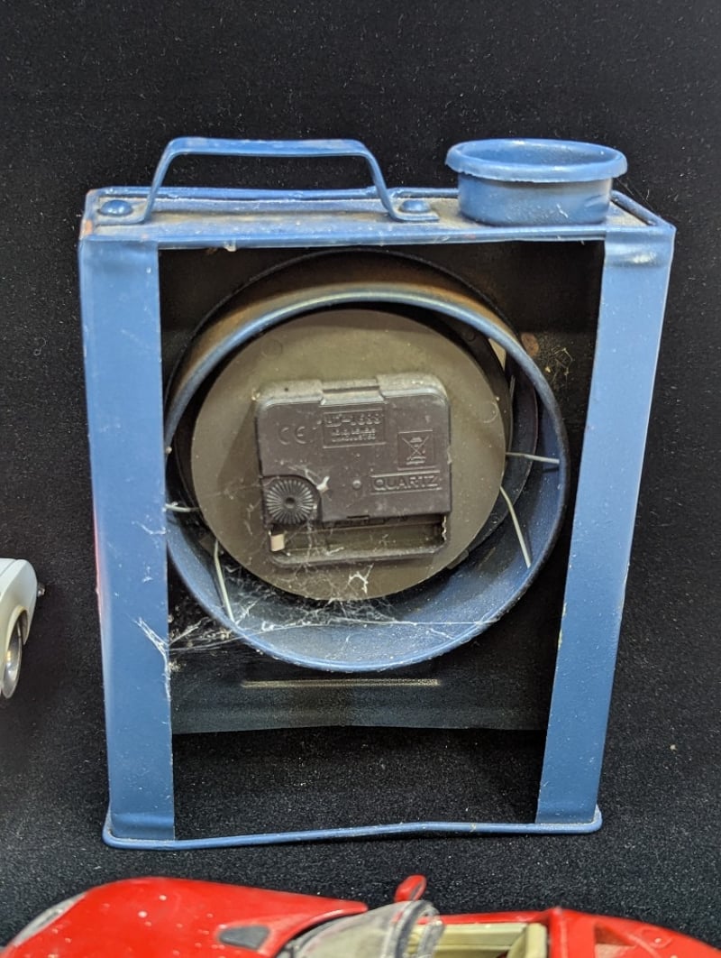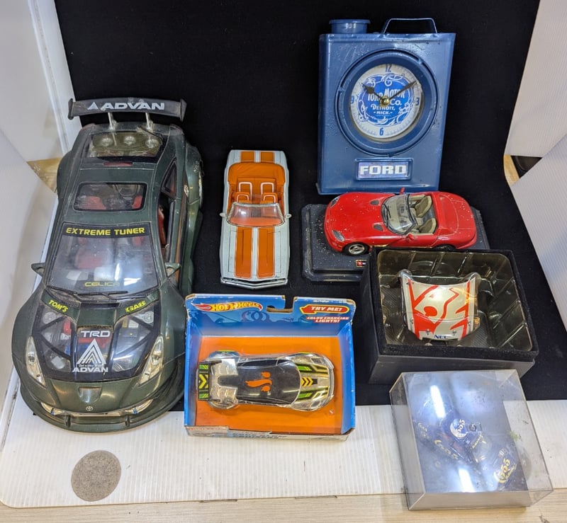 COLLECTION OF MODEL CARS AND FORD JERRY CAN STYLE CLOCK