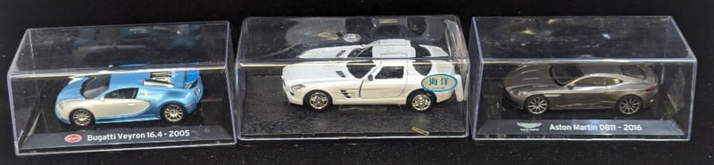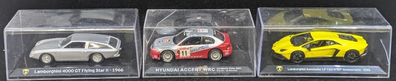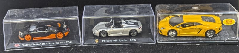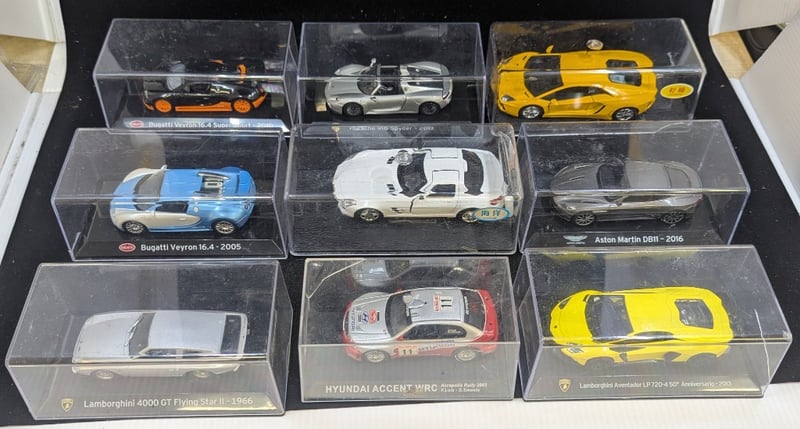 Cars Feature Plastic Cover And Plastic Bases, Cars Include Lamborghini 4000 Gt Flying Star - 1966, Hyundai Accent Wrc, Bugatti Veyron 16.4 - 2005, Aston Martin Db11 - 2016, Porsche 918 Spyder - 2013, Etc