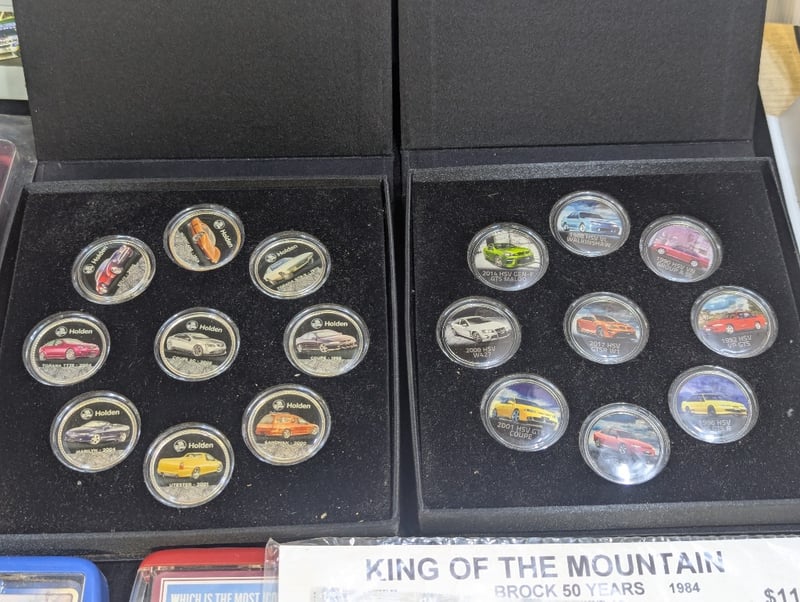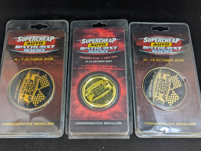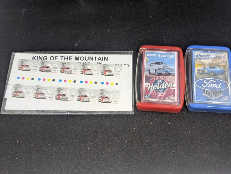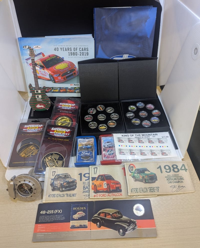Items Include Two Sets Of Commemorative Tokens, Ford And Holden Cards, 'King Of The Mountain Brock Fifty Years' Stamps, Three Soft Patches, Three Supercheap Auto Bathurst 1000 Commemorative Medallions, Two Auto Books, Battery Powered Clock, 2016 Heritage Holden Fifty Cent Coin