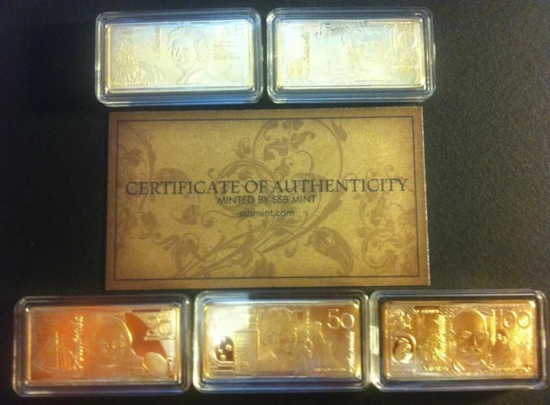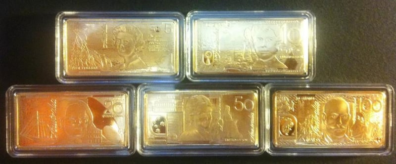 CERTIFIED SET OF 5 X 10 GRAM ``POLYMER NOTE SERIES`` FINISHED IN 999 24K GOLD PLATED