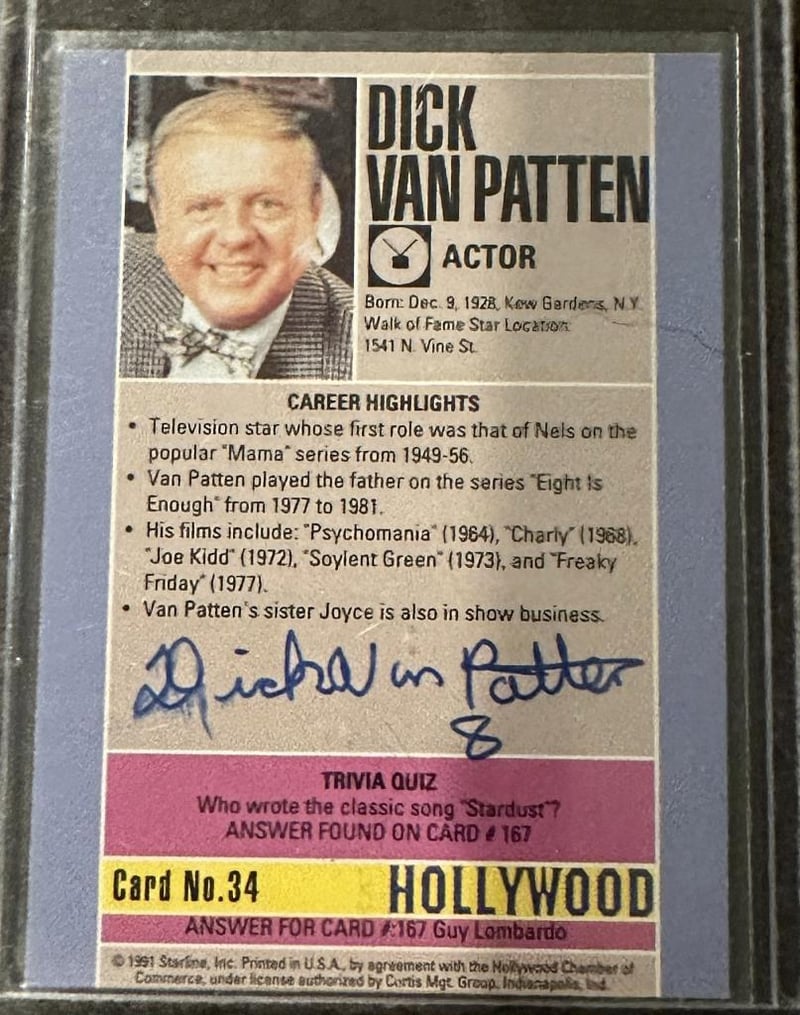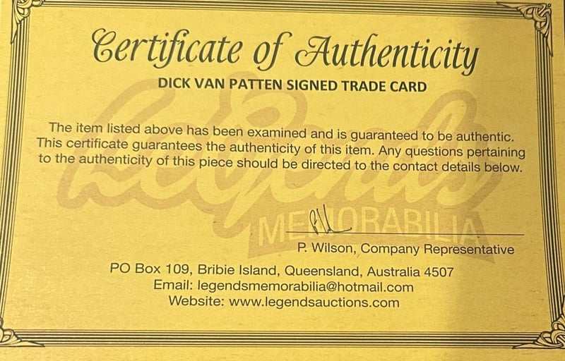 Dic Van Patten Personally Signed Trade Card. Dick Van Patten Was An American Actor, Comedian, Businessman, And Animal Welfare Advocate Whose Career Spanned Seven Decades Of Television. The Item Is Accompanied By A Certificate Of Authenticity.