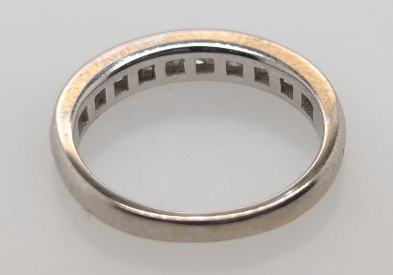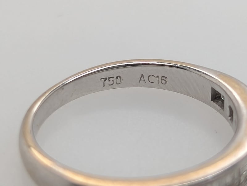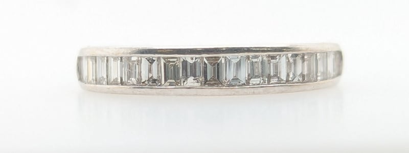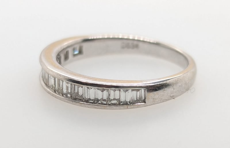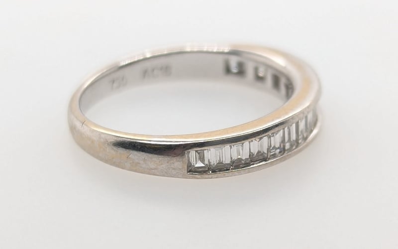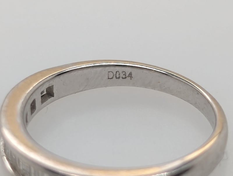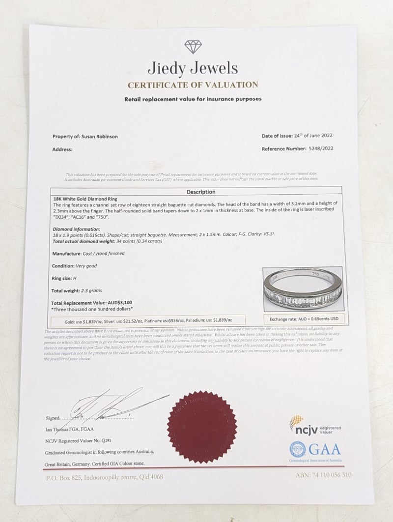 18K WHITE GOLD DIAMOND RINGRing Features 18 Baguette Cut Diamonds Channel Set Along Ring Band, Colour: F-G, Clarity: Vs-Sl, 0.34 Ct Total Diamond WeightTotal Item Weight: 2.30gMarkings: D034, 750, Ac16Condition: Good - Refer To ImagesThis valuation has been conducted by an independent third-party professional. The valuation amount is an assessment by the issuing valuer and does not reflect the auction value of the item.Any inquiries regarding the valuation should be directed to the issuing valuer (refer to contact details on the certificate), as Lloyds Auctions has no affiliation or influence over the valuation, the valuer, or the stated amount.Insurance Replacement Valuation Amount: $3,100.00584285+2