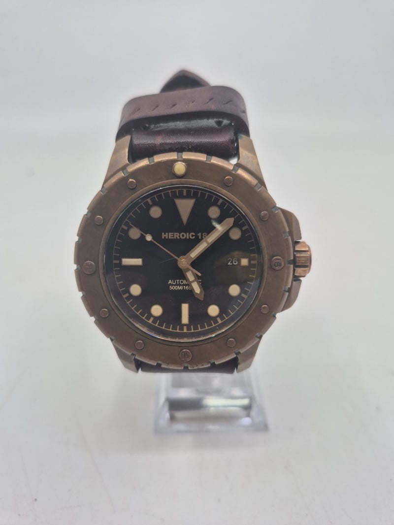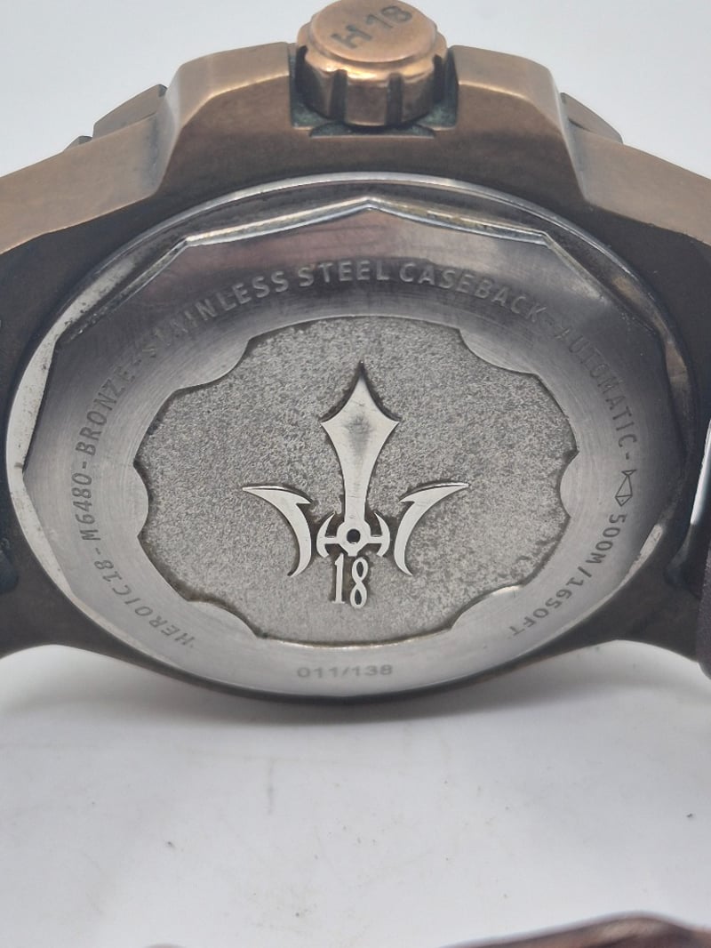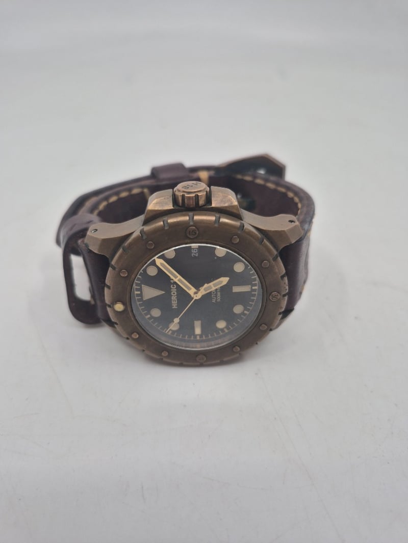 HEROIC 18 BRONZE DIVER CASE DESCRIPTION: BRONZE - STAINLESS STEEL CASEBACK BRACELET: LEATHER MOVEMENT: AUTOMATIC BOX: NOT INCLUDED PAPERS: NOT INCLUDED Condition: Good - Refer To Images Additional Information: 11/138 586174+5