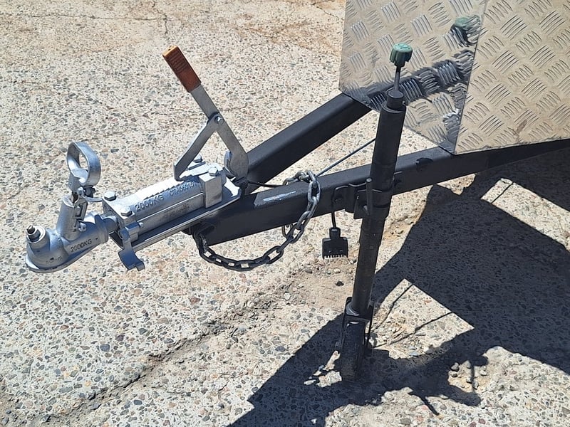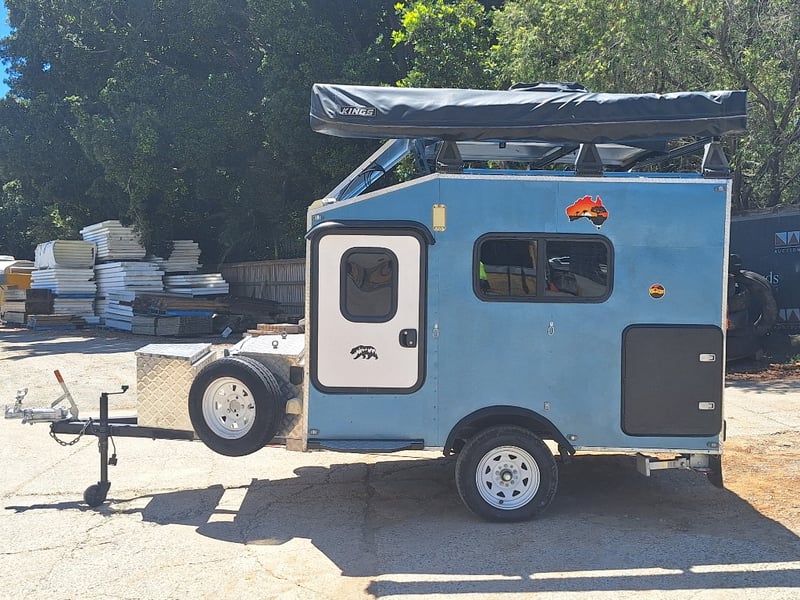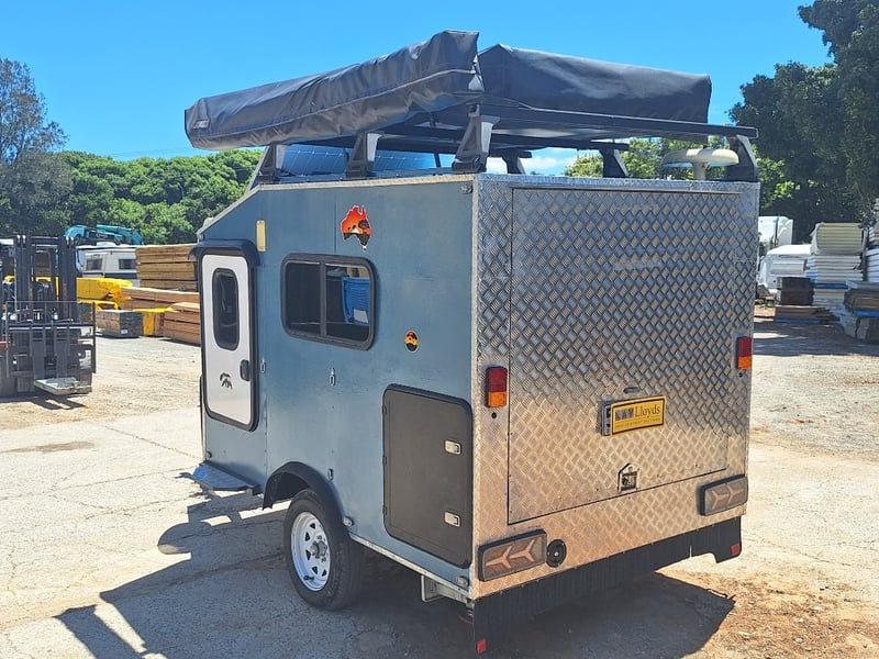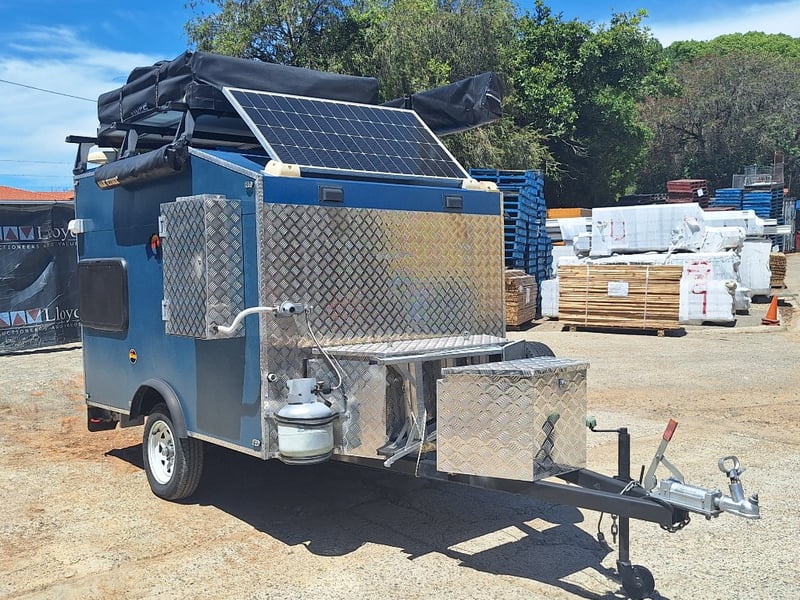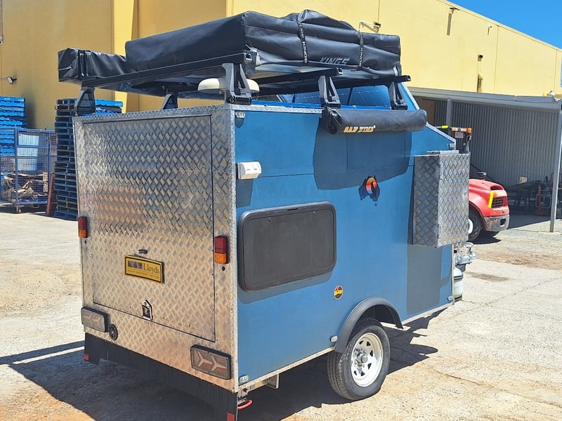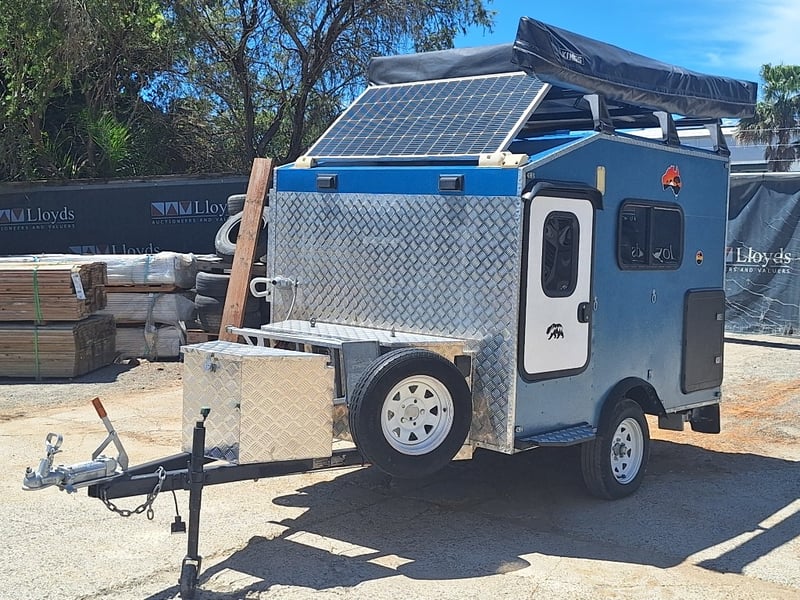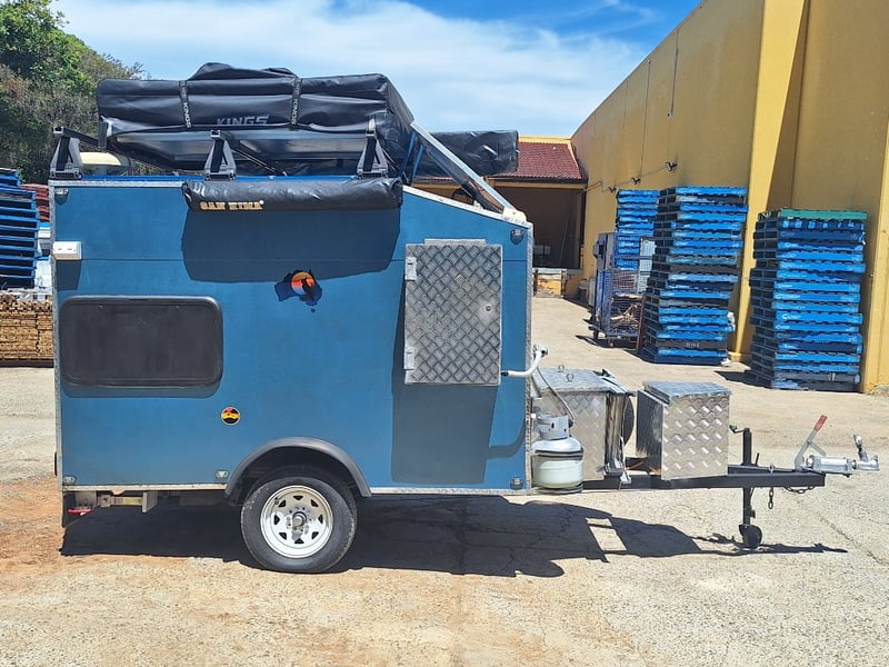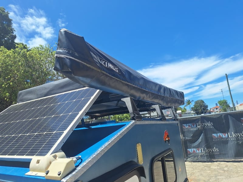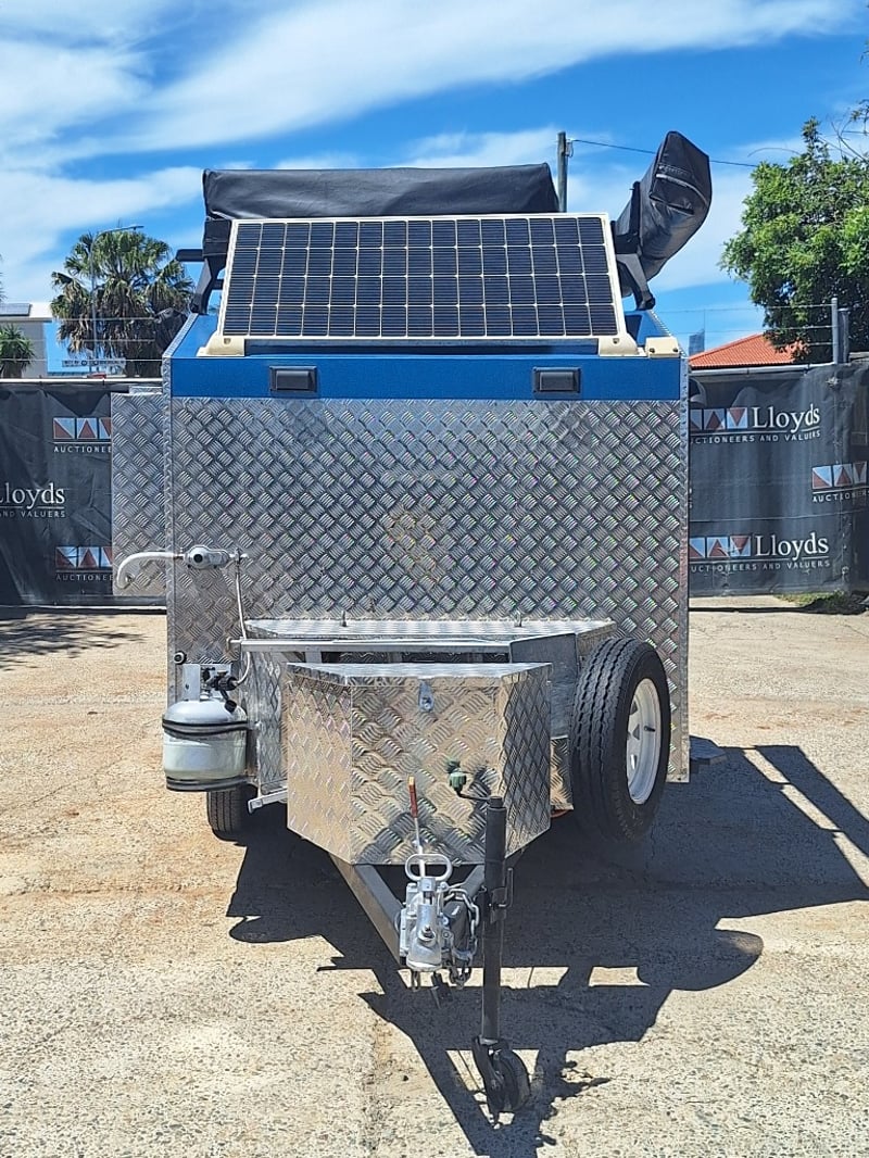 Description/Extras: Custom Built Camper Trailer, 50mm Hitch, Jockey Wheel, 7Pin Flat Male Connection, Front Mounted Checkerplate Storage x 2, Includes Tarps And Canvasses, Battery Isolater, Solar Charge Controller, Full Automatic Protect Quick Charger, Spare Tryre, Hot Water System With Portable Shower, Table, Retractable Awnings, Solar Panel, Kings Slide Out Fridge Freezer, Roof Mounted Pop Up Tent, Internal Matress, Lights, T.V, Oven, Portable Toilet, Plus More