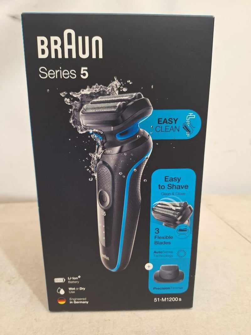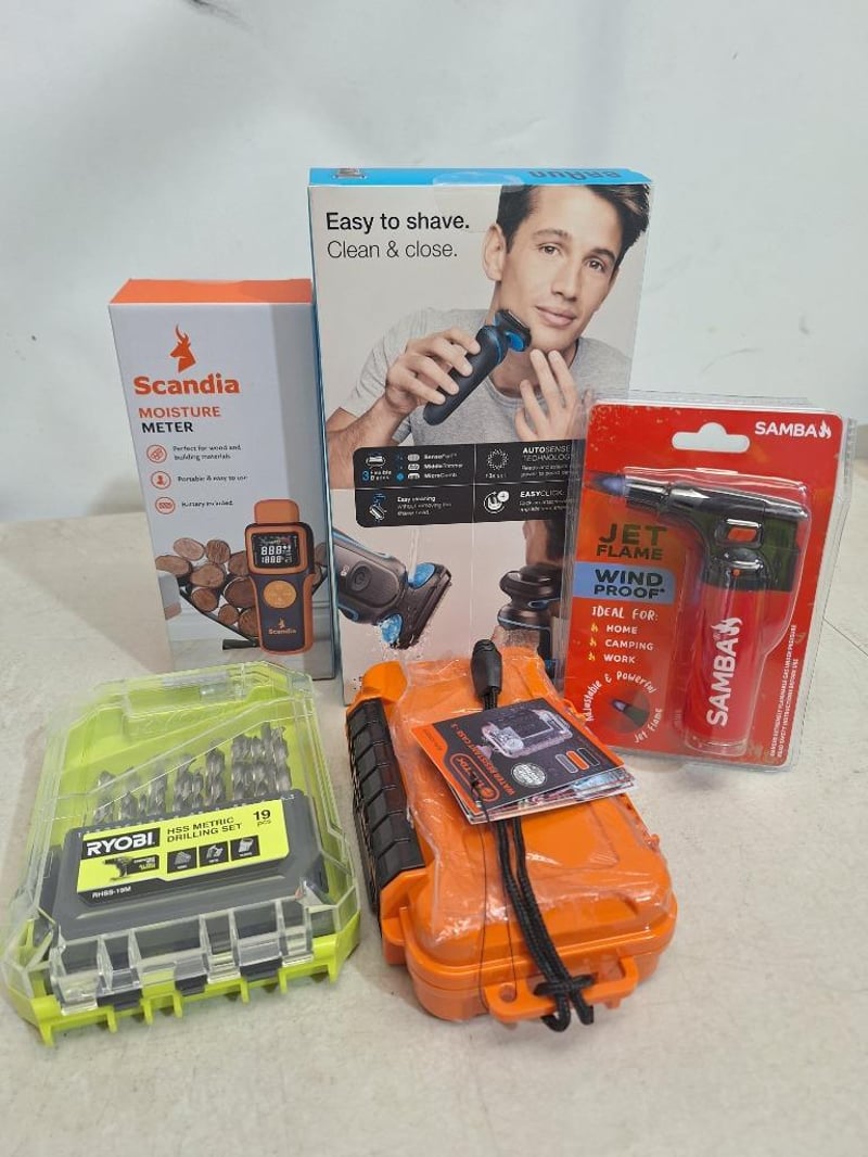 1x BRAUN series 5 shaver, Model:51-M1200s, 3 flexible blades, RRP$169, NEW factory sealed in box ,1x RYOBI 19pcs HSS bits metric drilling set, RHSS-19M, NEW factory sealed in box, 1x SCANDIA moisture meter, LCD screen, NEW factory sealed in box, 1x TACTIX water resistant case-s, BUN-320070, NEW with tags, 1x SAMBA jet flame windproof burner, NEW factory sealed in package