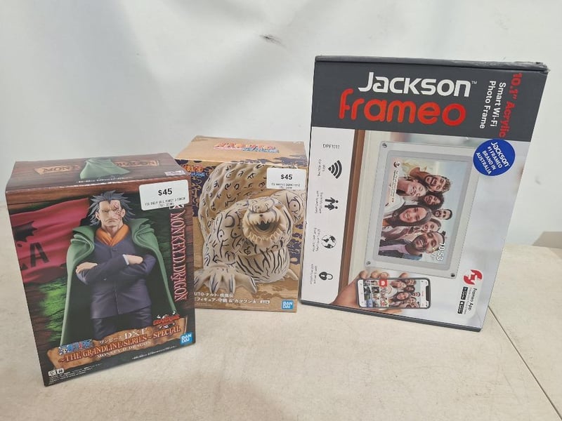 1x BANDAI figuring "Monkey.D.dragon", RRP $45, New factory sealed in box, 1x BANDAI figuring "Naruto", RRP $45, New factory sealed in box, 1x JACKSON FRAMEO 10.1" acrylic smart wi-fi photo frame, DPF1111, New factory sealed in box