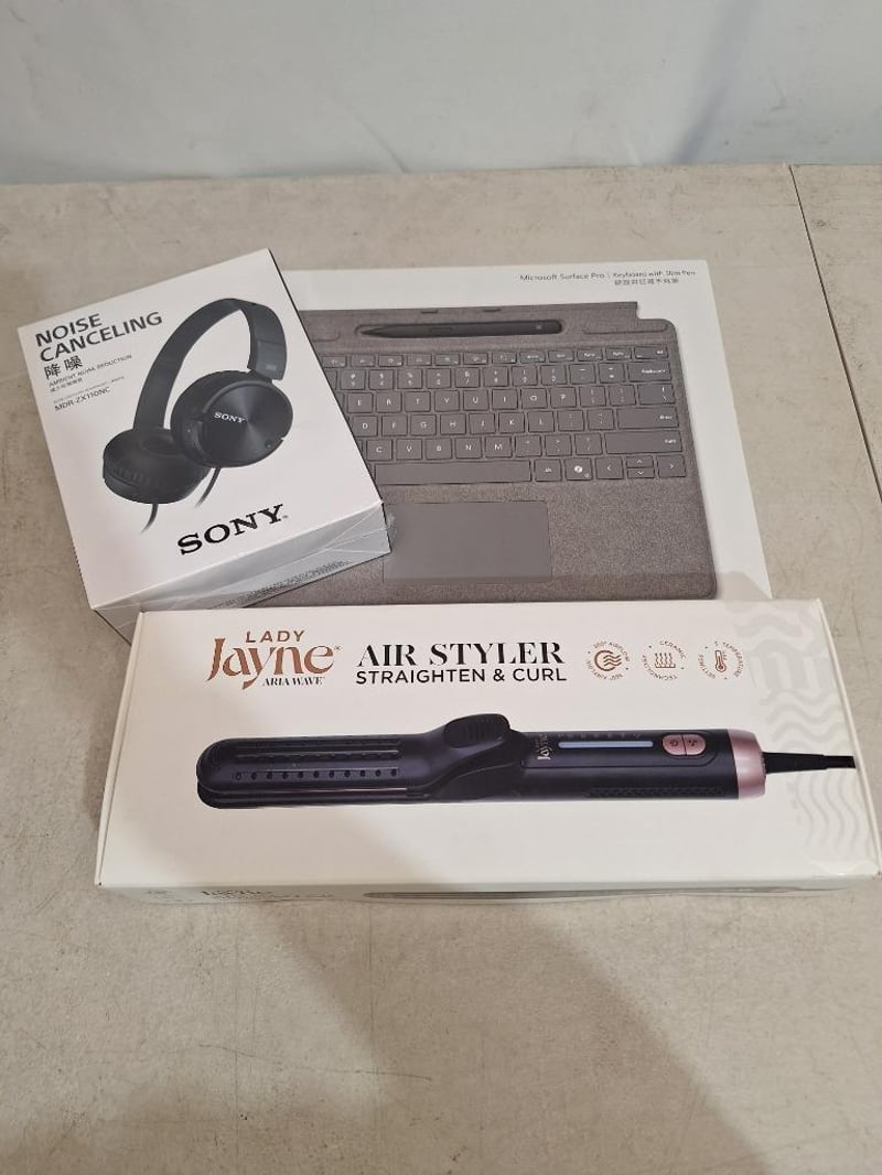 1x SONY noise canceling black headphones MDR-ZX110NC, NEW factory sealed, 1x LADY JAYNE air styler straighten & curl, NEW factory sealed in box, 1x MICROSOFT surface pro keyboard with slim pen RRP$289 NEW factory sealed in box