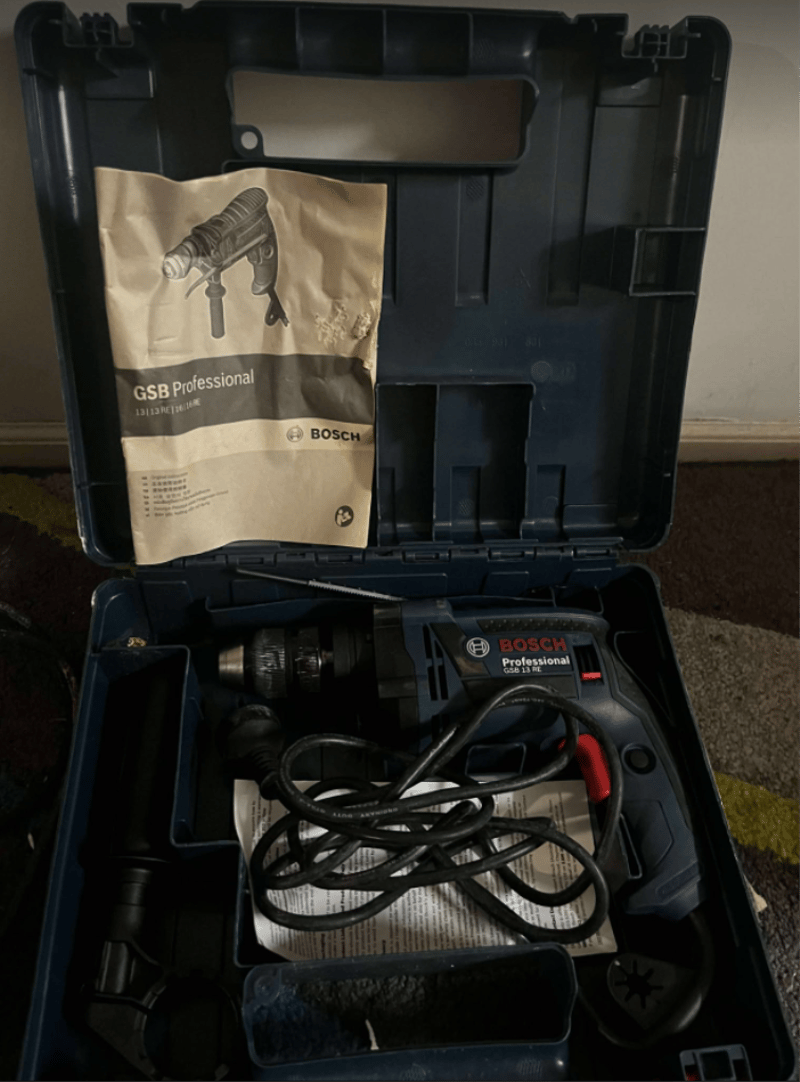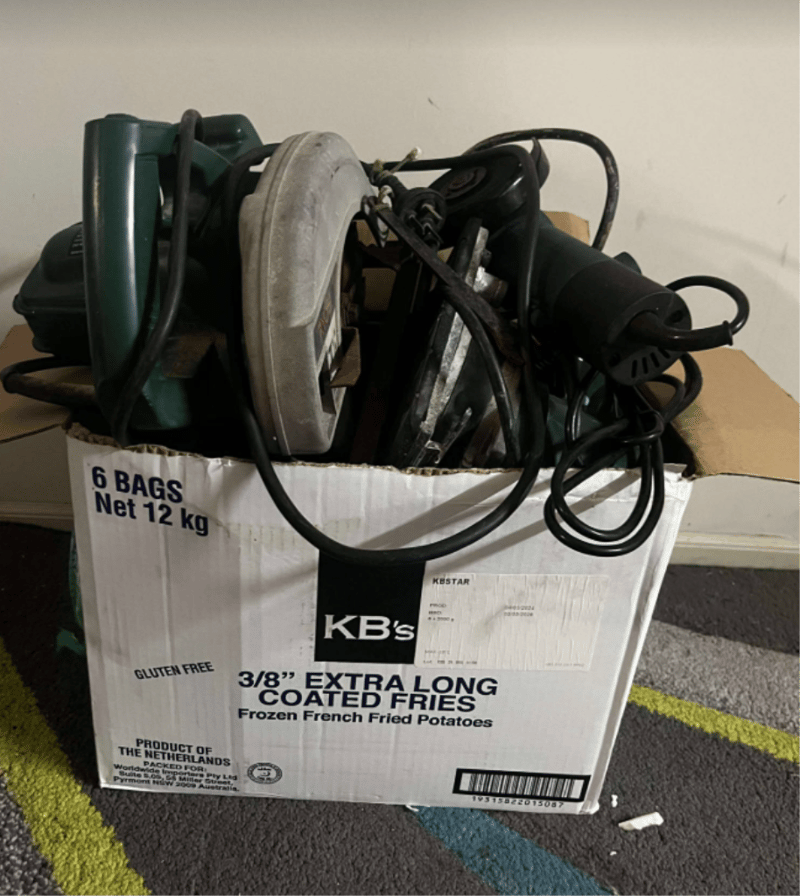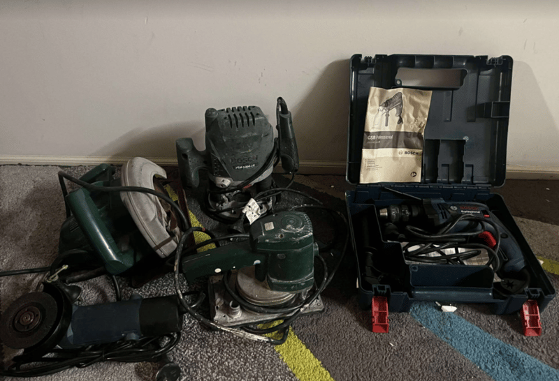 Box of Mixed Tools – Ryobi Circular saw, Bosch angle grinder, Bosch POF 1200 AE router, Stayer LOM 412 Orbital sander, Bosch Professional GSB impact drill. Refer to images.