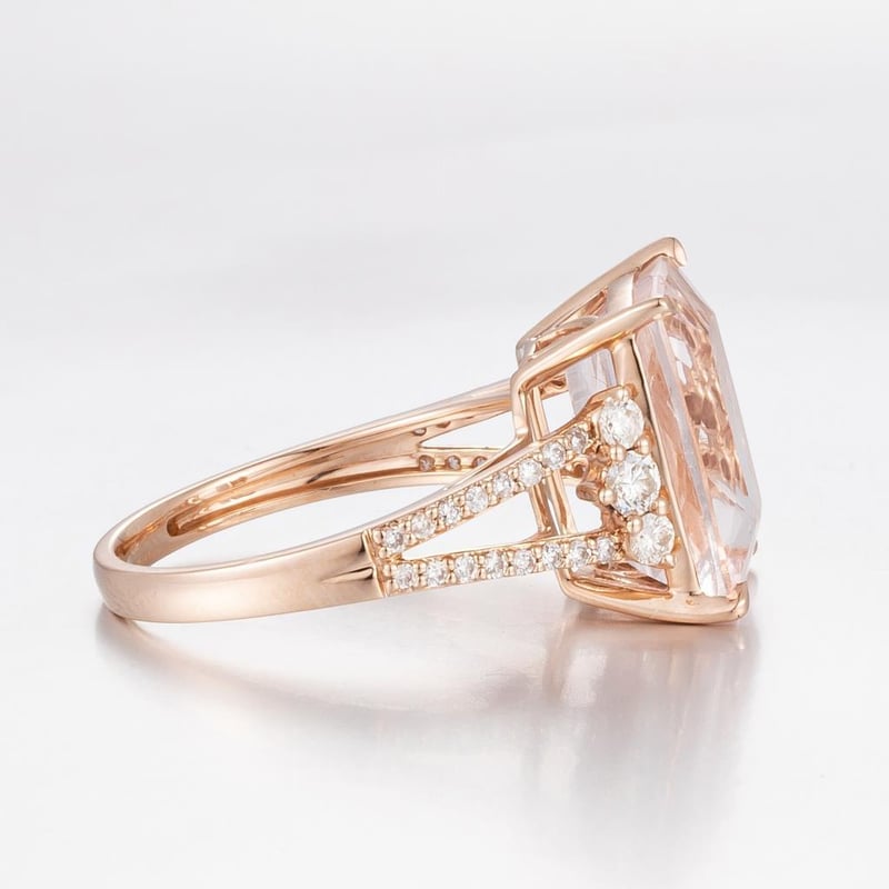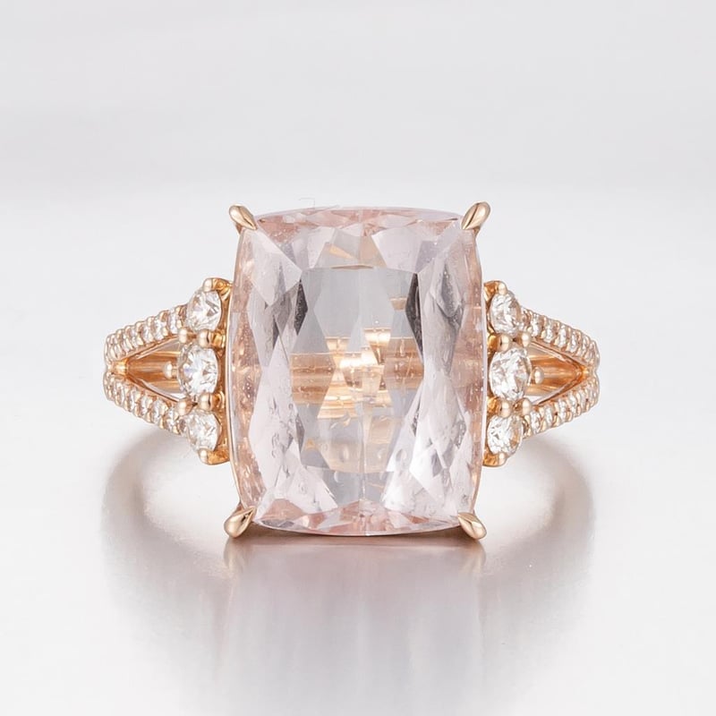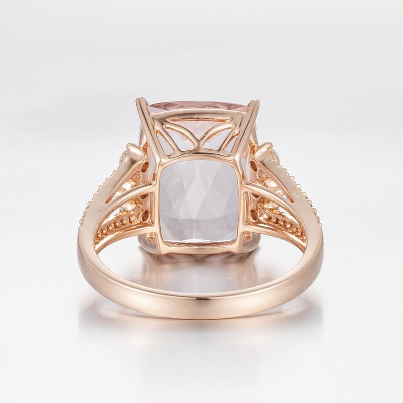 14Ct Rose Gold Brazilian Morganite And Diamond Cocktail Ring Featuring Centre, One Rectangular Cushion Cut, Light Peach-Pink Brazilian Morganite (6.49Ct, Slight Inclusions), Claw Set, With 38 Round Brilliant Cut Diamonds (0.44Ct Tdw, G-H Colour, Si1-Si2 Clarity), Bead Set. Ring Size O.