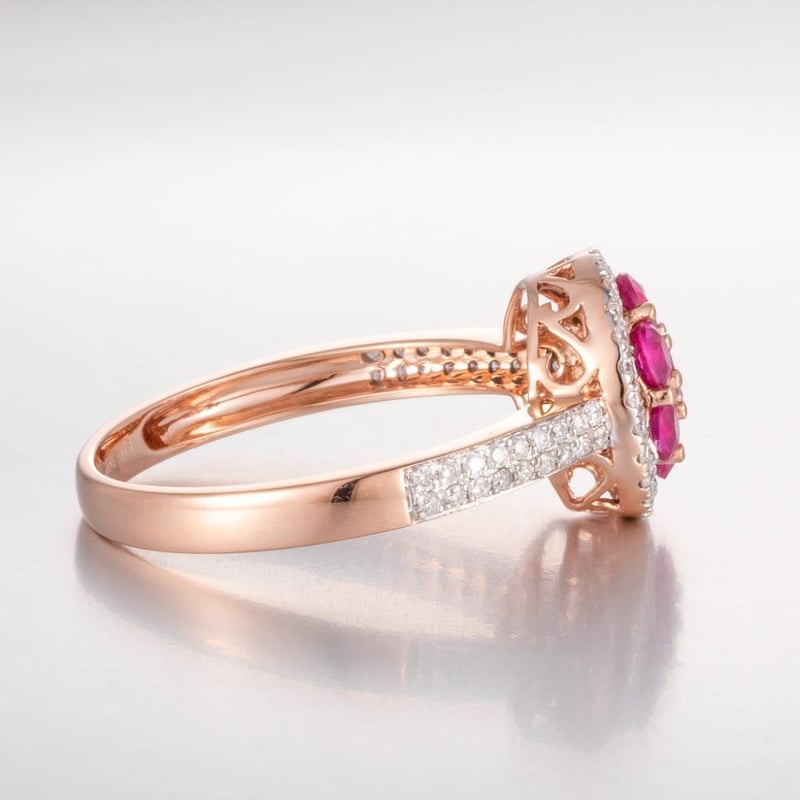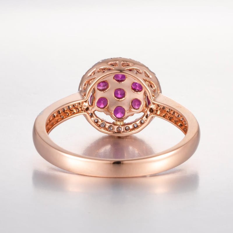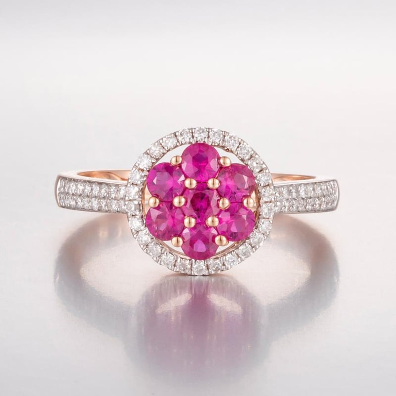 14Ct Rose Gold Pink Ceylon Sapphire And Diamond Cluster Ring Featuring Centre, 7 Round Cut, Strong Vivid Reddish-Pink Ceylon Sapphires (0.79Ct Tsw, Slightly Included), Claw Set, With 62 Round Brilliant Cut Diamonds (0.29Ct Tdw, G-H Colour, Vs2 Clarity), Bead Set. Ring Size O.