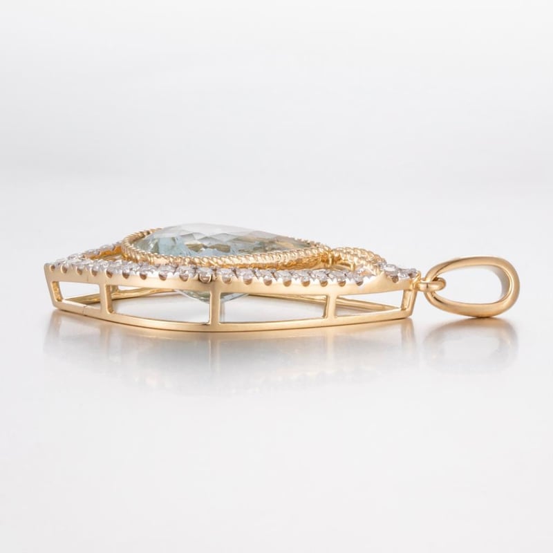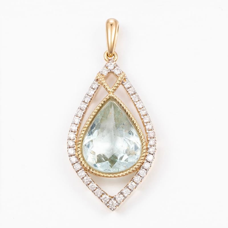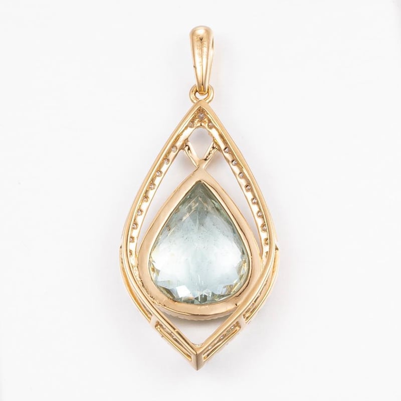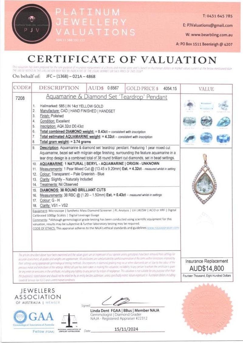 14CT YELLOW GOLD AQUAMARINE AND DIAMOND PENDANT 14Ct Yellow Gold Aquamarine And Diamond Pendant Featuring Centre, One Pear Mixed Cut, Pale Greenish Blue Aquarmine (4.32Ct, Slightly-Naturally Included), Bezel Set, With 38 Round Brilliant Cut Diamonds (0.43Ct Tdw, G-H Colour, S1-Vs2 Clarity), Bead Set. Valuations Provided by an Independent Third-Party Professional Not Directly Associated With Lloyds Auctions at AUD $14800This valuation has been conducted by an independent third-party professional. The valuation amount is an assessment by the issuing valuer and does not reflect the auction value of the item. Any inquiries regarding the valuation should be directed to the issuing valuer (refer to contact details on the certificate), as Lloyds Auctions has no affiliation or influence over the valuation, the valuer, or the stated amount. Condition: Good - Refer Images 0586222+1382