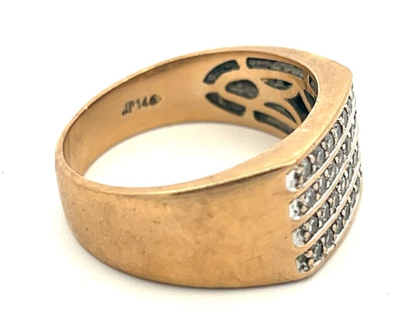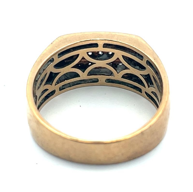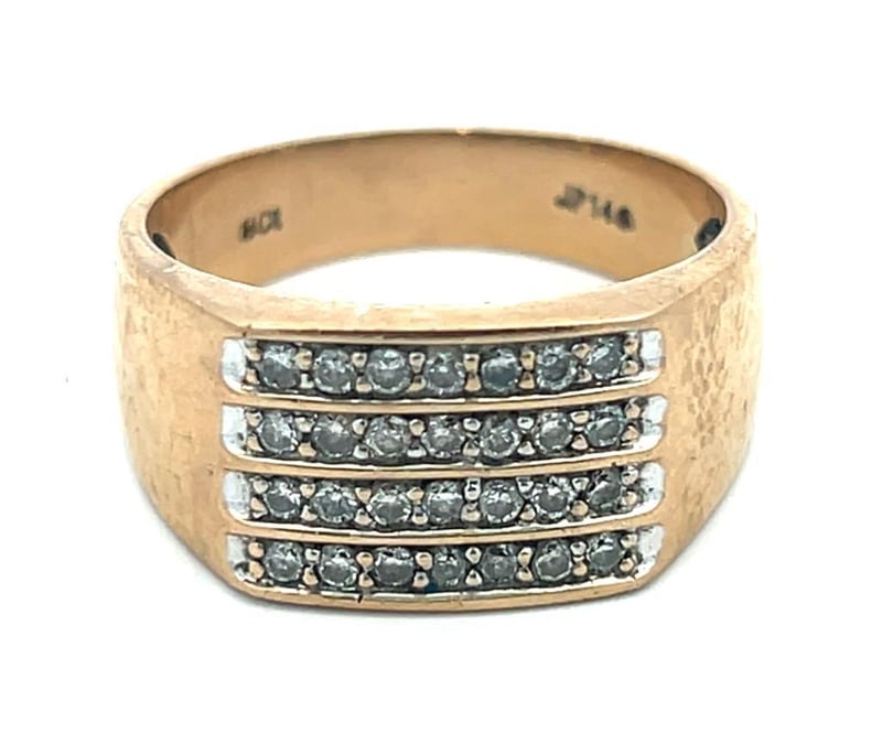 9CT YELLOW GOLD DIAMOND MEN'S RING, 21 ROUND BRILLIANT CUT DIAMONDS CLAW SET IN 4 ROWS OF 7 DIAMONDS, ESTIMATE TOTAL DIAMOND WEIGHT 0.16CT, STAMP 9CT, RING WEIGHT 6.57 GRAMS. THIS ITEM HAS BEEN PROFESSIONALLY VERIFIED AS A GENUINE PRODUCT AND COMES WITH ACCOMPANYING 3RD PARTY CERTIFICATE OF AUTHENTICITYCondition: Good - Refer To Images