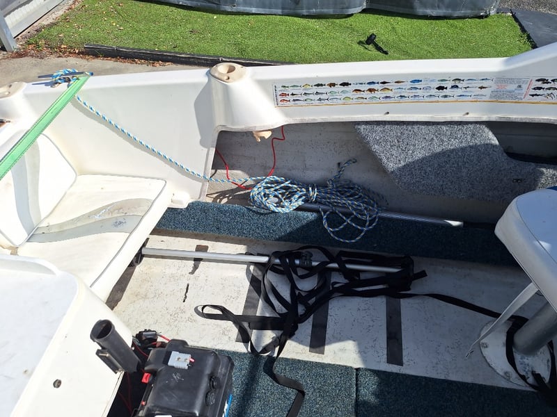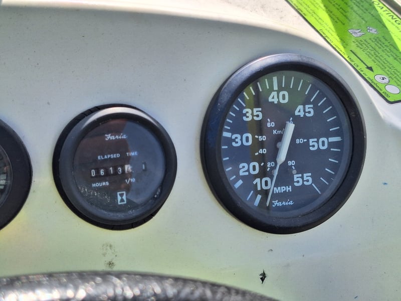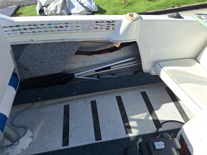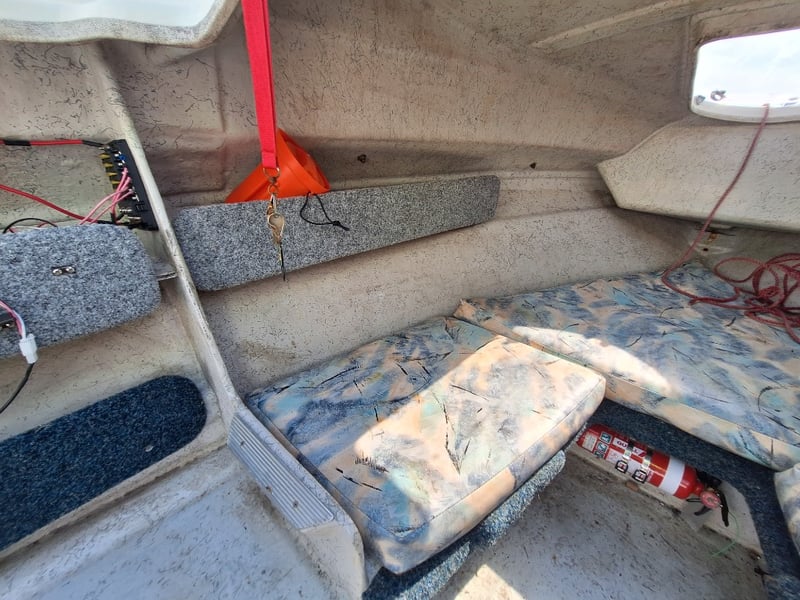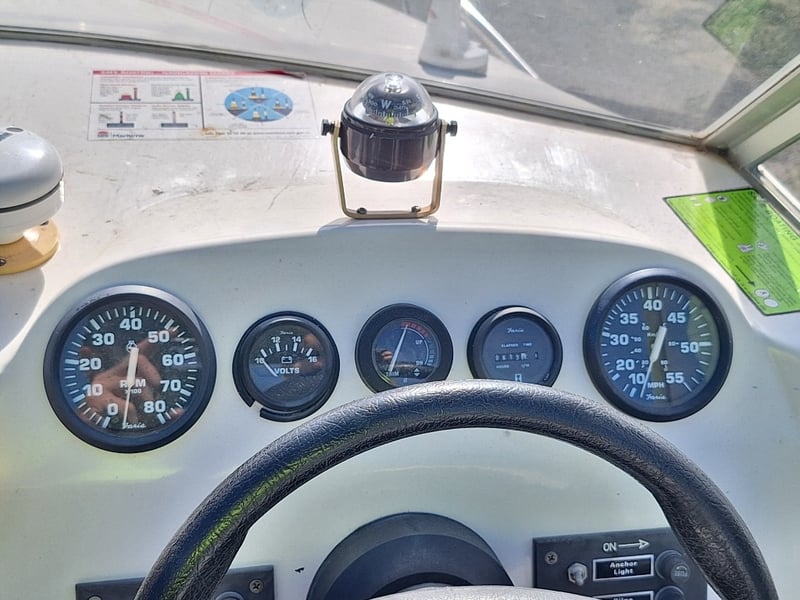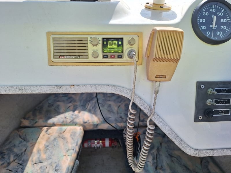 Description: Anchor With Rope, Battery Isolator, GME VHF Radio, Humminbird Sounder, Compass, Gauge Cluster, Console Switches (Unknown Working Condition), Boat Cover