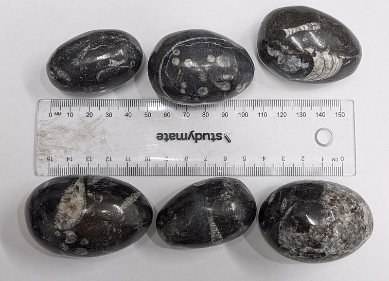 SIX HAND CARVED EGGS MADE FROM 400 MILLION YEAR OLD FOSSIL FILLED MARBLE FROM MOROCCO