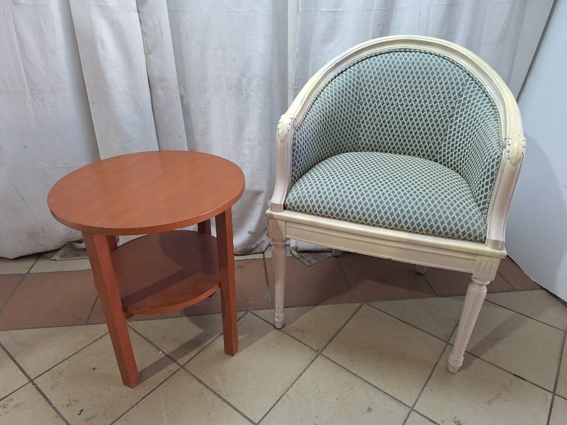 Chair & Side Table, Timber Style, Natural Finish Dimensions Table H:55cm W:49cm D:49cm Dimensions Chair H:88cm W:62cm D:50cm SOLD AS LOT