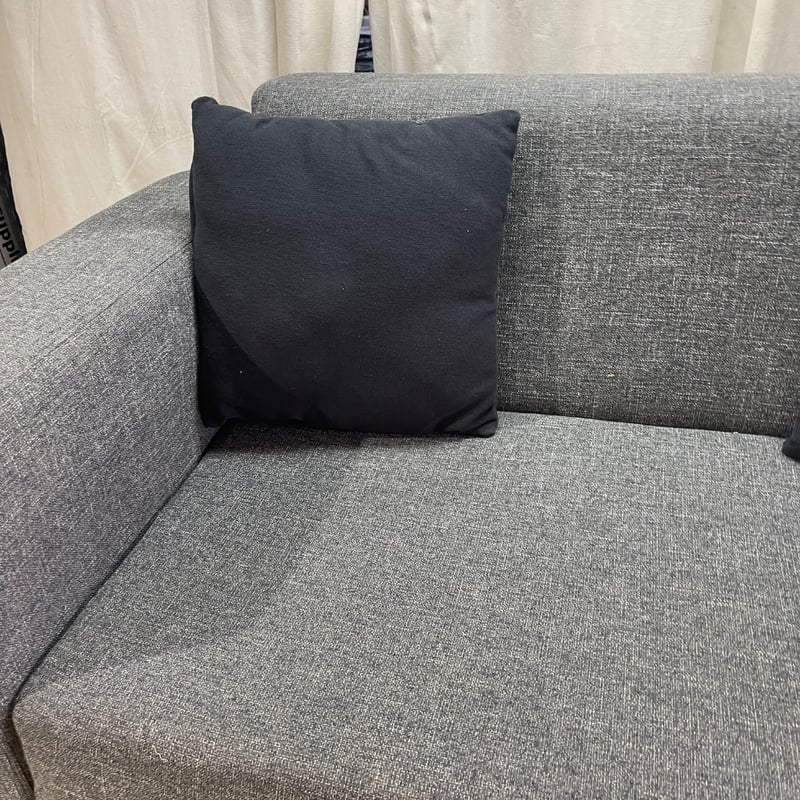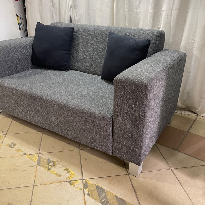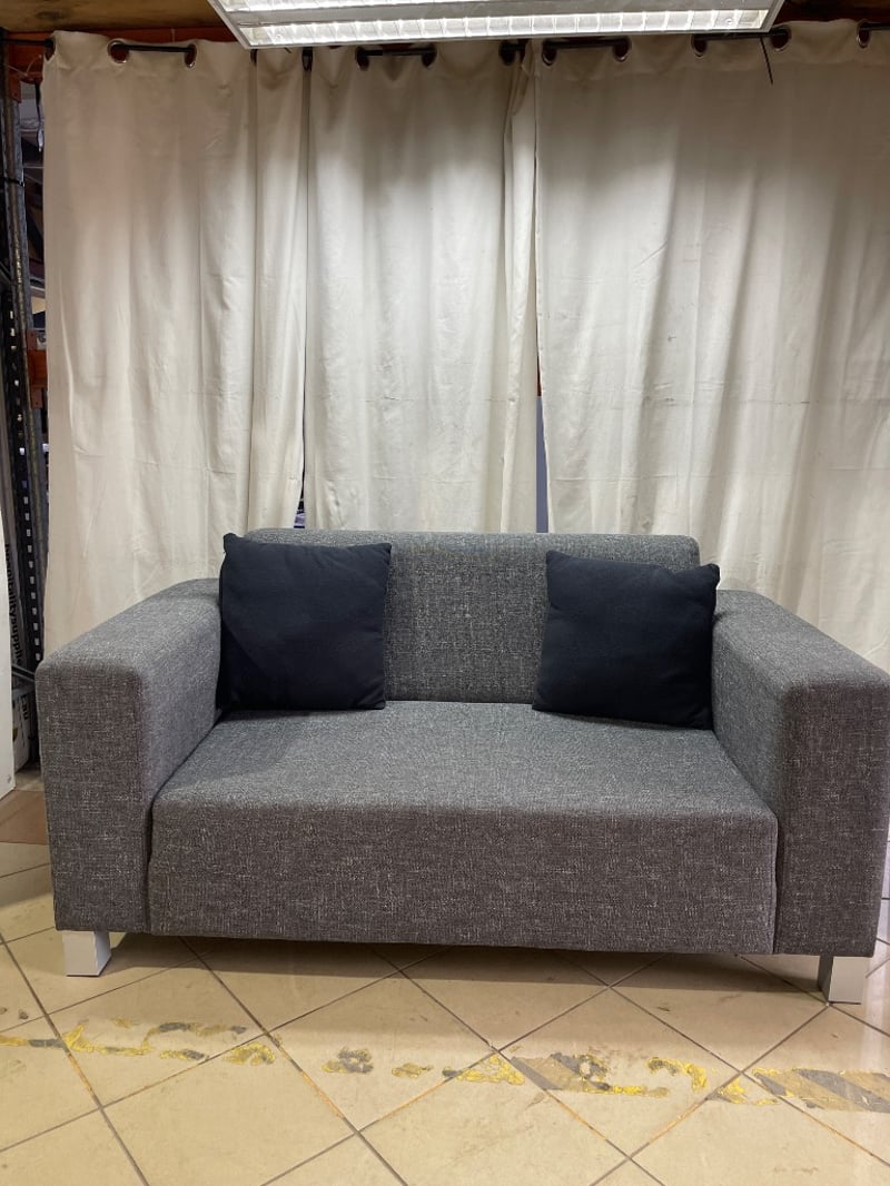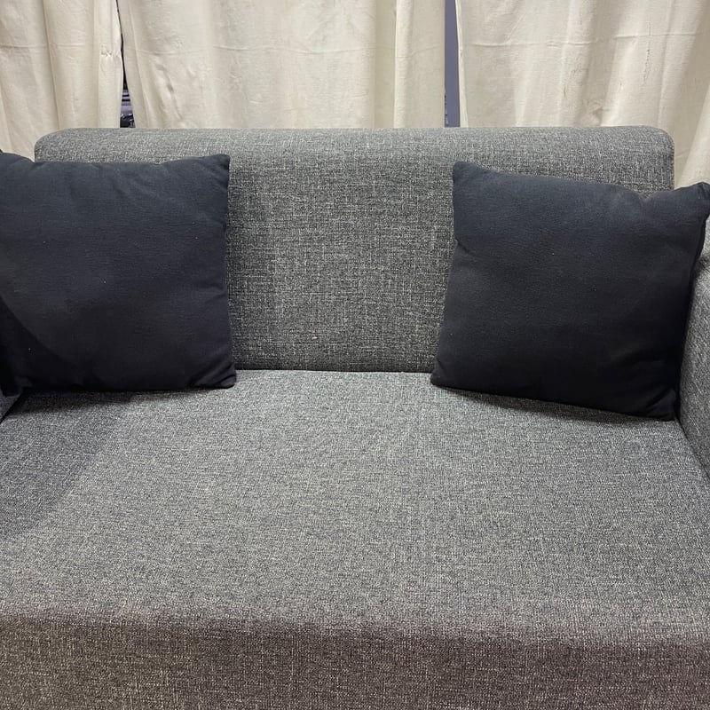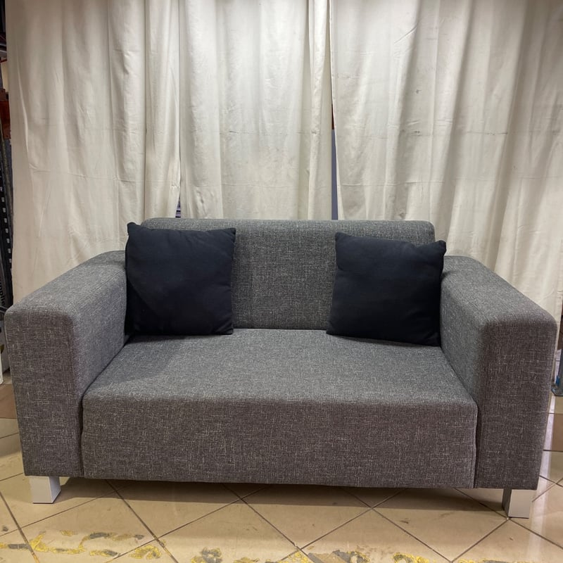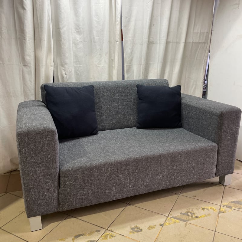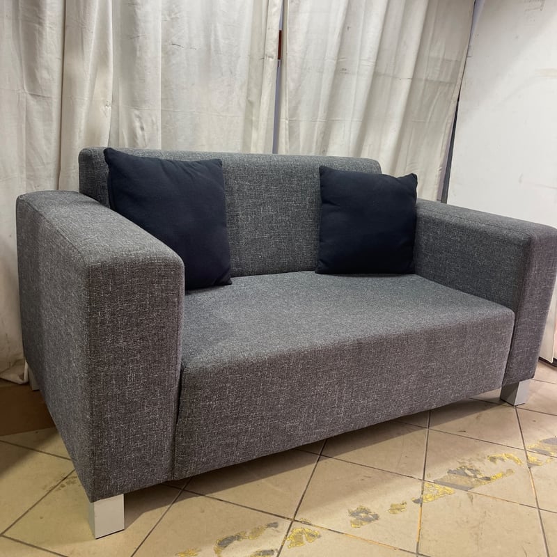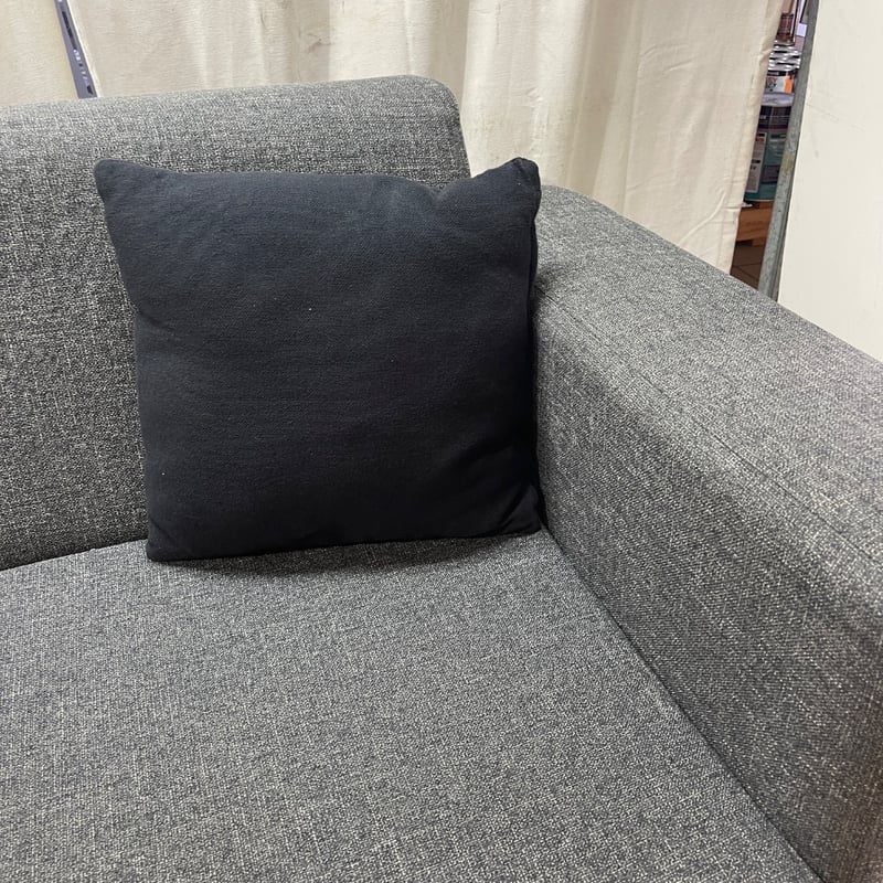 Modern two-seater lounge chair upholstered in charcoal-grey textured fabric with contrasting black cushioned accent pillows.