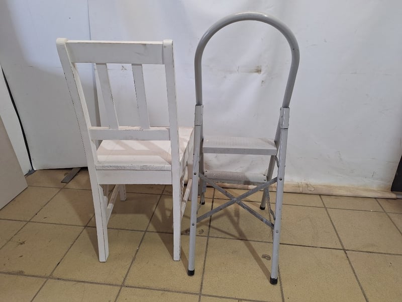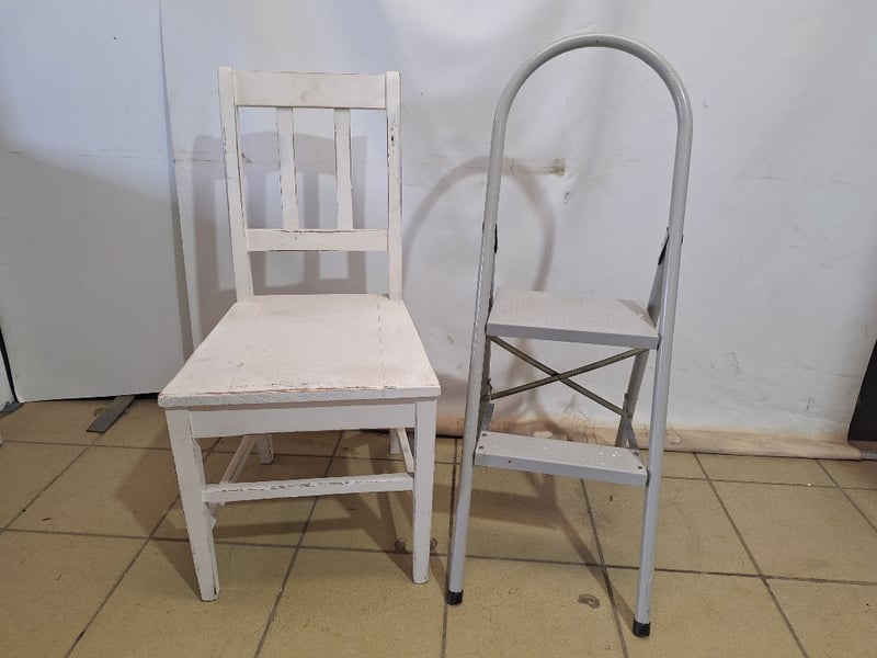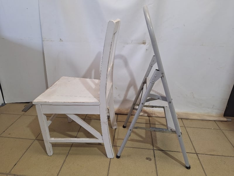 x1 Step Ladder, Metal Style, Grey Finish & x1 Stool Timber Style, White Finish Dimensions Chair H:91cm W:44cm D:47cmDimensions Ladder H:99cm W:36cm D:50cmSOLD AS LOT