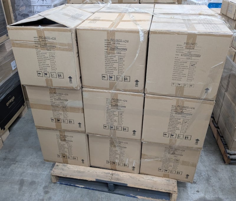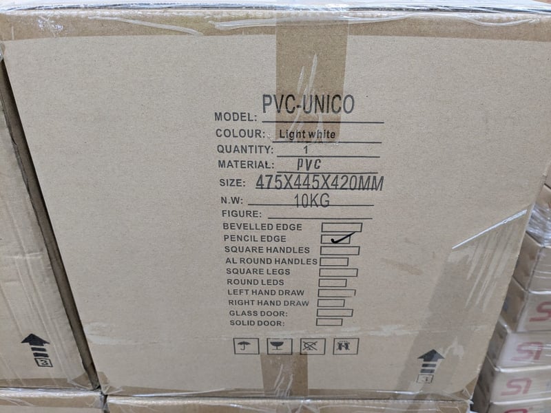 Bathroom Vanity, Model: PVC-UNICO-CM, PVC White Door Panel, Dimensions approx: 48x44x42cm QTY:18 to pallet, Sold as pallet lot,