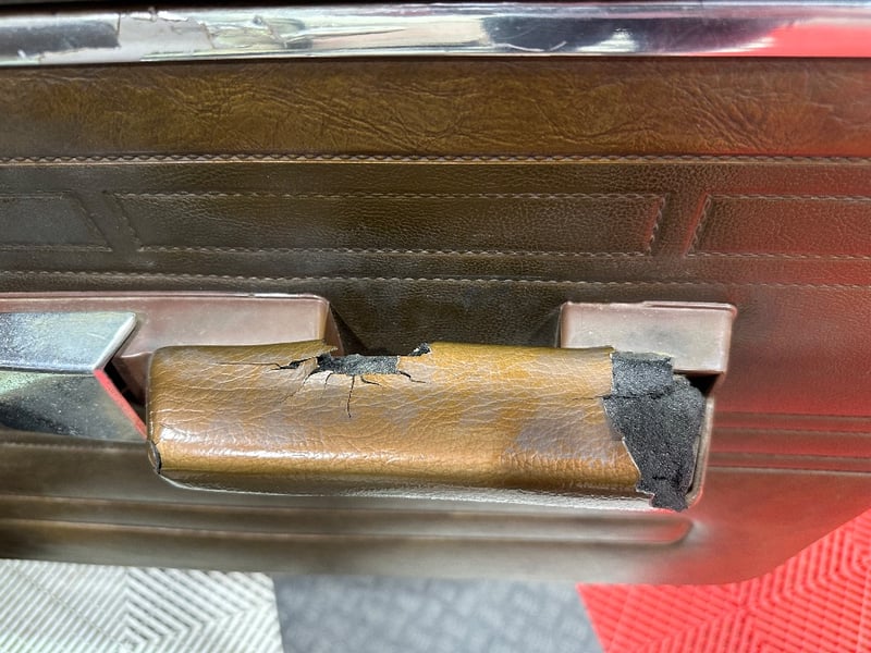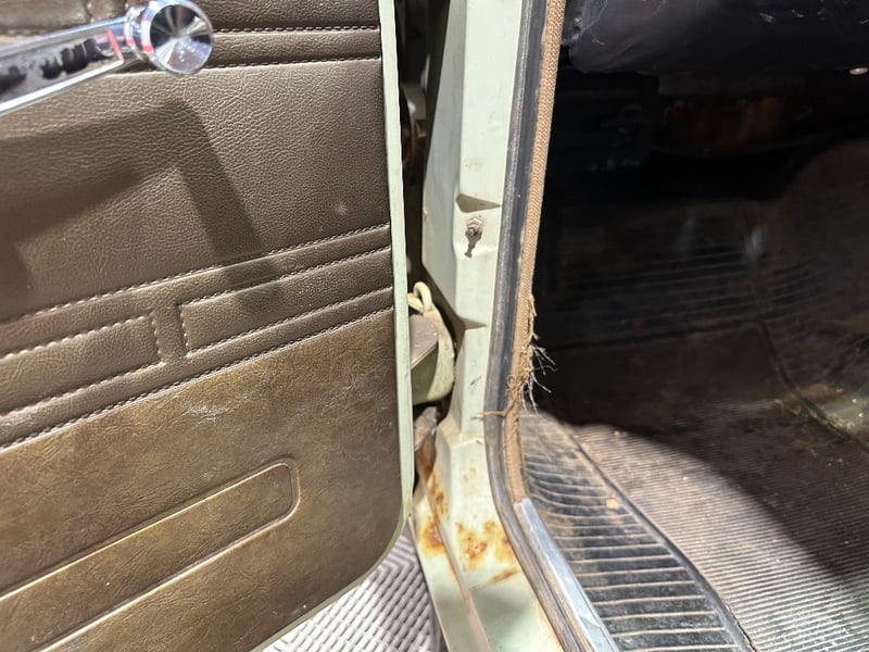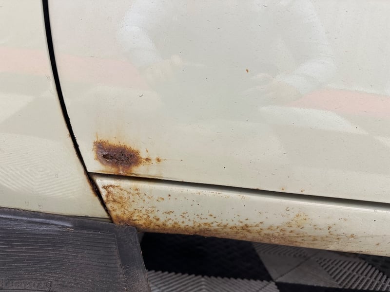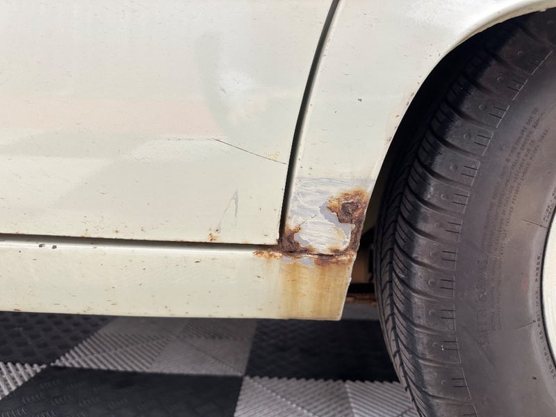 Age-related wear is present, including surface rust on lower door sections, wear to the door handle leather, paint chips, minor dents, and deterioration of the lower door rubber seals. An in-person inspection is recommended to assess the condition.