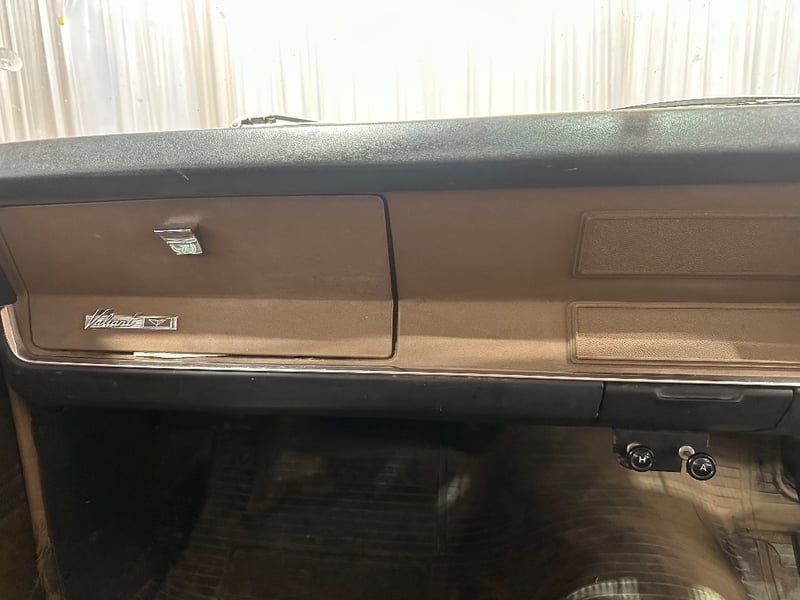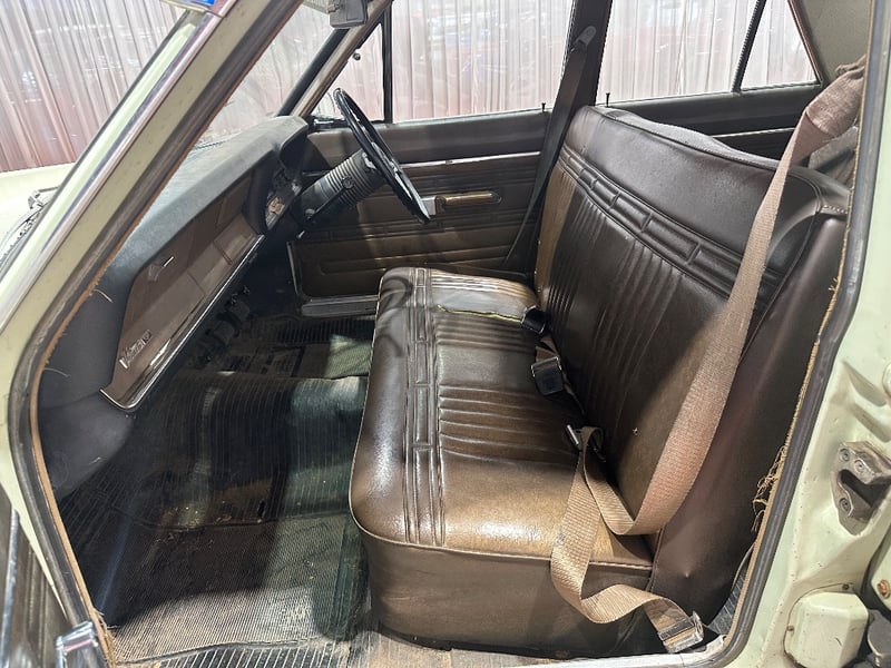 The car retains its period brown vinyl interior, including ribbed upholstery on both rows of seating and the factory dashboard featuring the signature horizontal speedometer layout used throughout the VG series. The vehicle is accompanied by its original owner’s manual, log books, Valiant Certified Car Care Plan, and is noted as being a one-owner example.