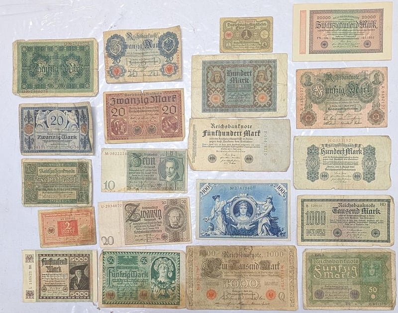 BANKNOTE COLLECTION OF TWENTY OLD MOSTLY 1920S GERMAN GERMANY BANKNOTESMost 1920S Including Inflation Banknotes. Some Earlier. Circulated Condition584988+23