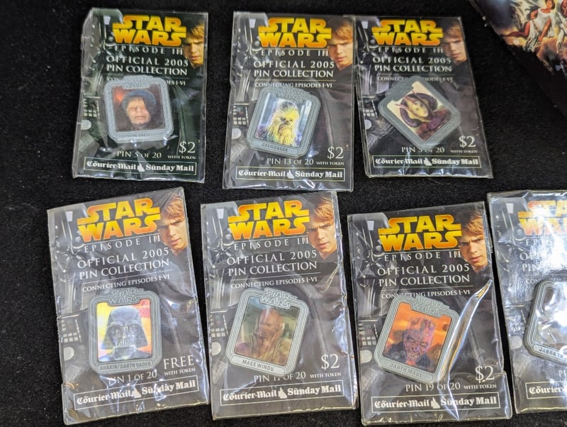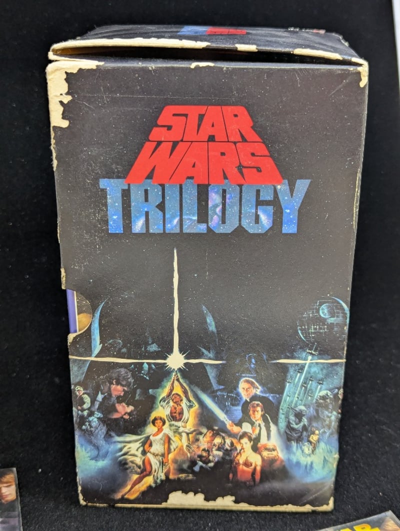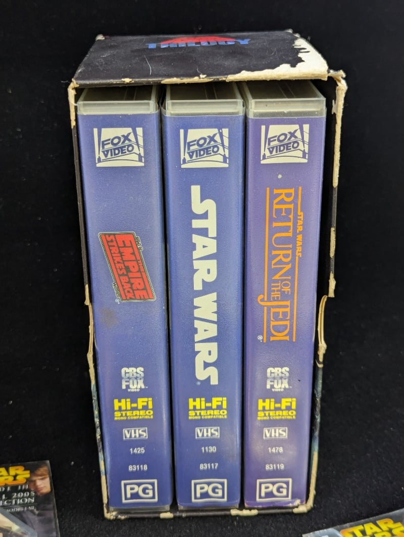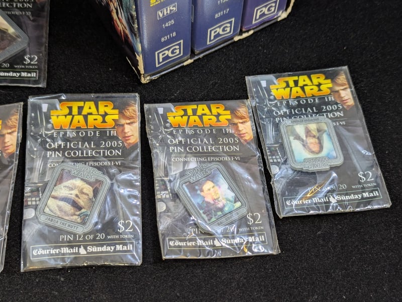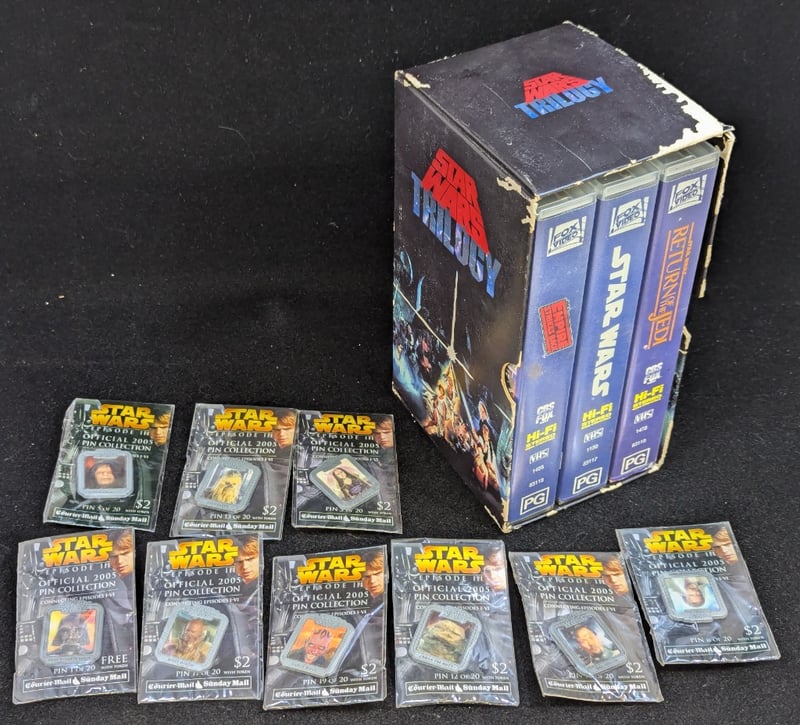 STAR WARS ORIGINAL TRILOGY VHS BOX SET AND COLLECTION OF 2005 STAR WARS PINS