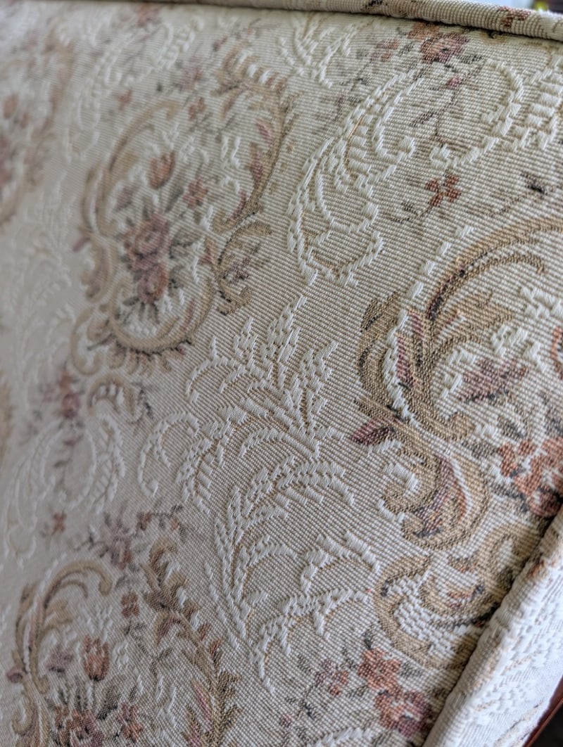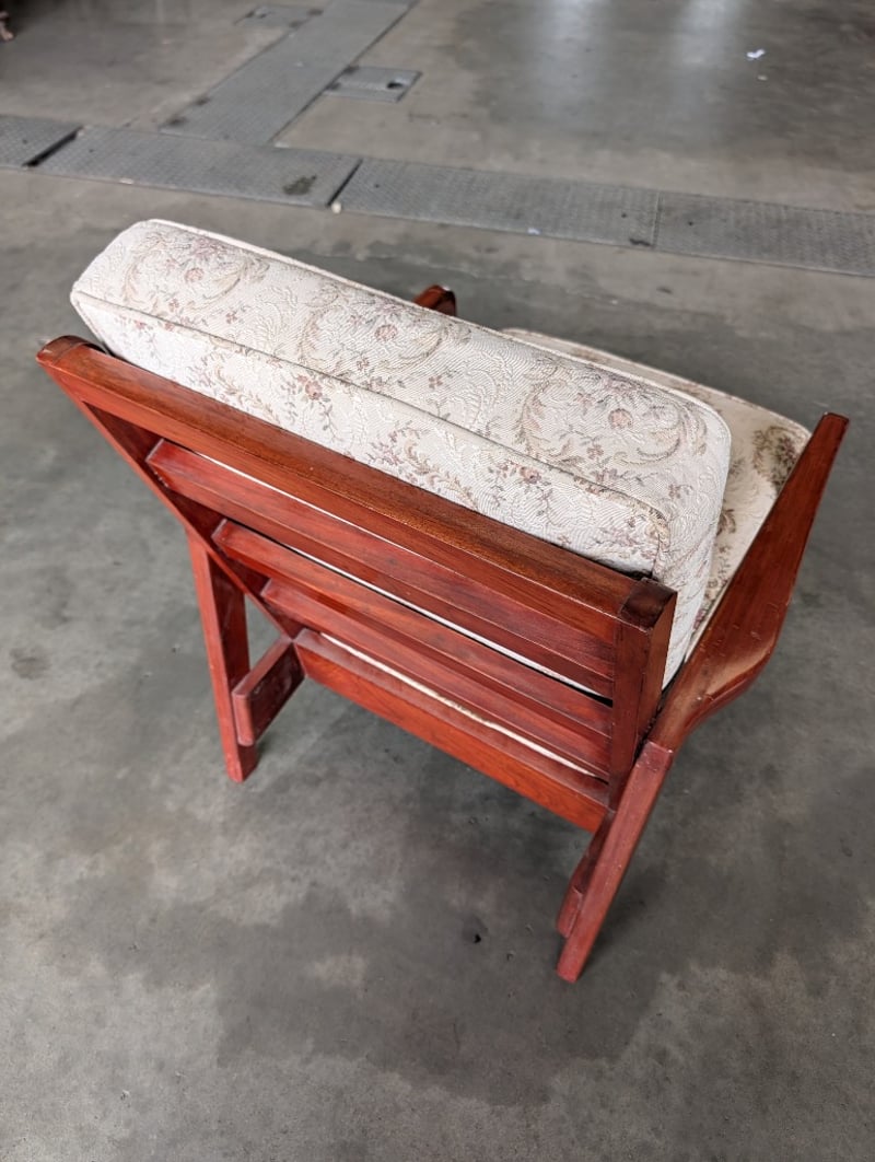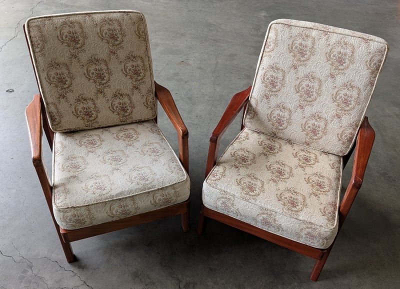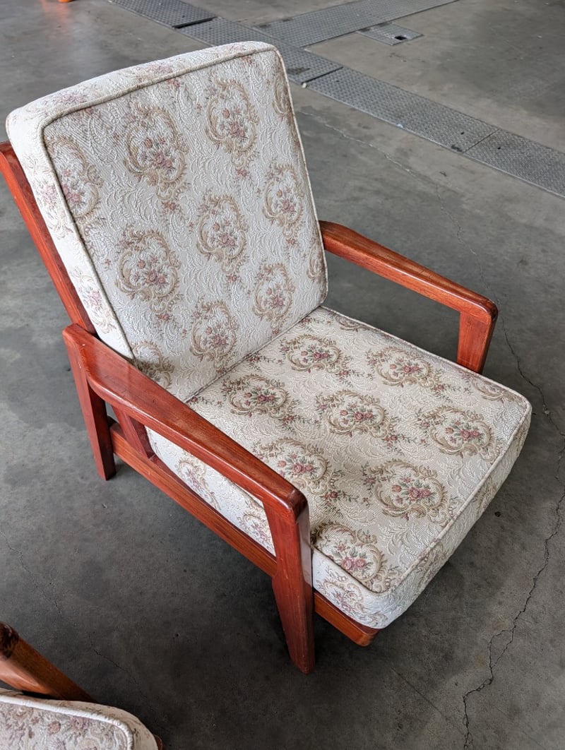2 x Mid-Century Modern style lounge chair, featuring a solid wooden frame with open arms and a vintage-inspired floral fabric upholstery. Dimensions: 65cm(W) x 87cm(D) x 81cm(H) Note: Sold as lot