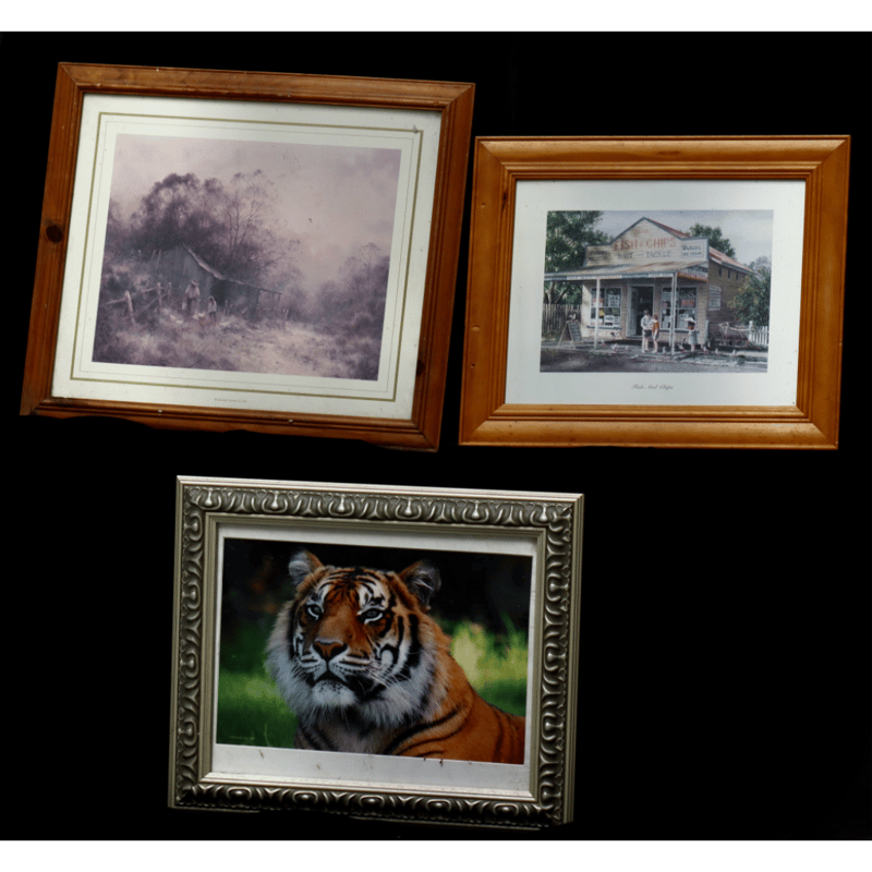 3 X FRAMED PRINTS, WOLLOMBI FARM NSW, FISH AND CHIP AND TIGER PHOTOGRAPH. ALL IN WOODEN FRAMES. CONDITION: PRE-OWNED. Condition: PRE-OWNED 645933+9204