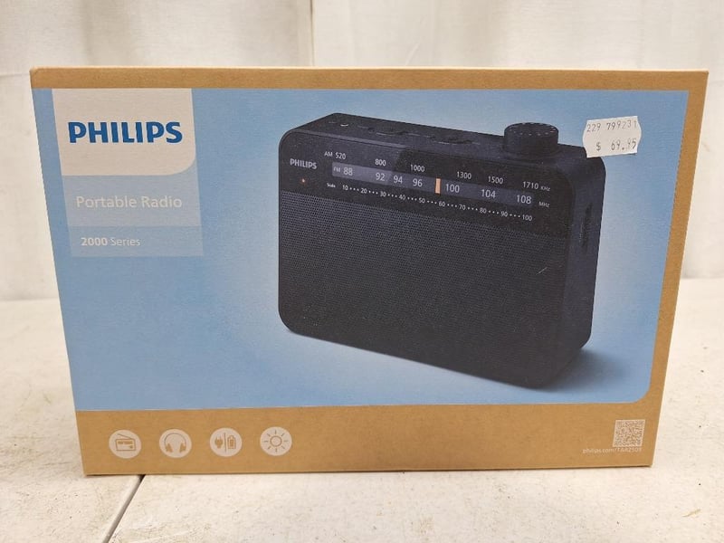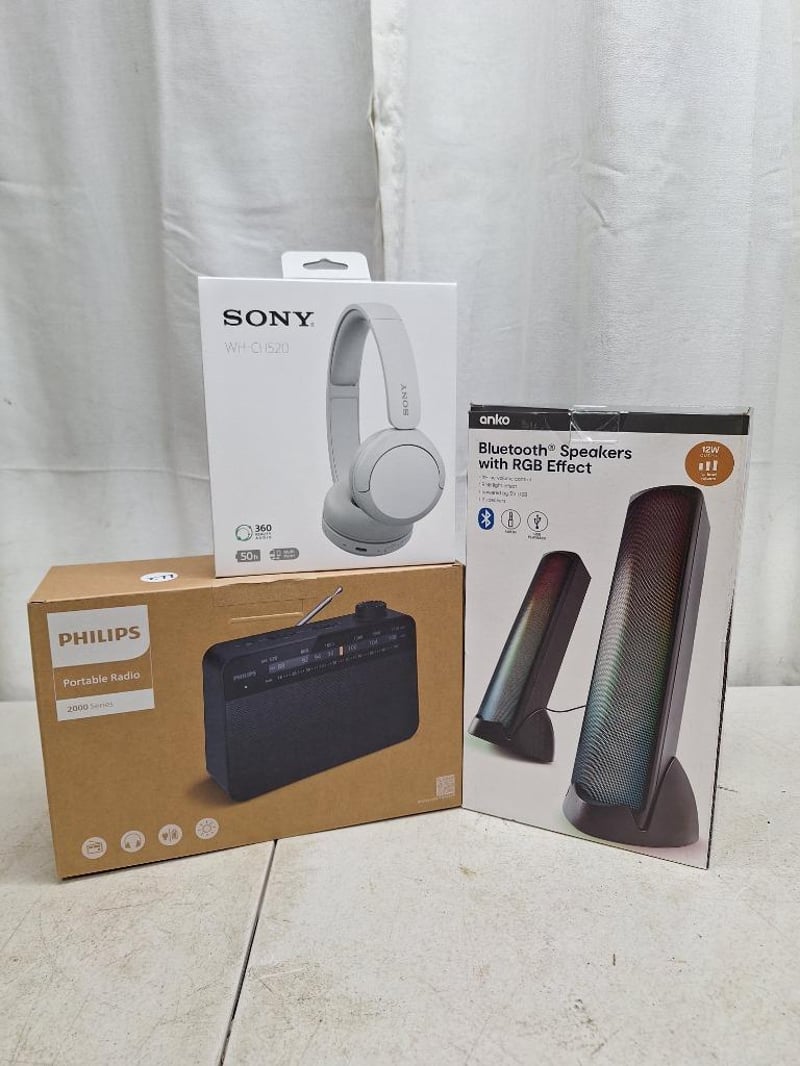1 x PHILIPS potable radio, 2000 series, RRP$69.95, NEW factory sealed in box, 1 x SONY 360 reality audio, 50 hours, Model:YY2958, NEW factory sealed in box, 1 x ANKO BlueTooth Speakers with RGB effect, 12W outut, NEW factory sealed in box