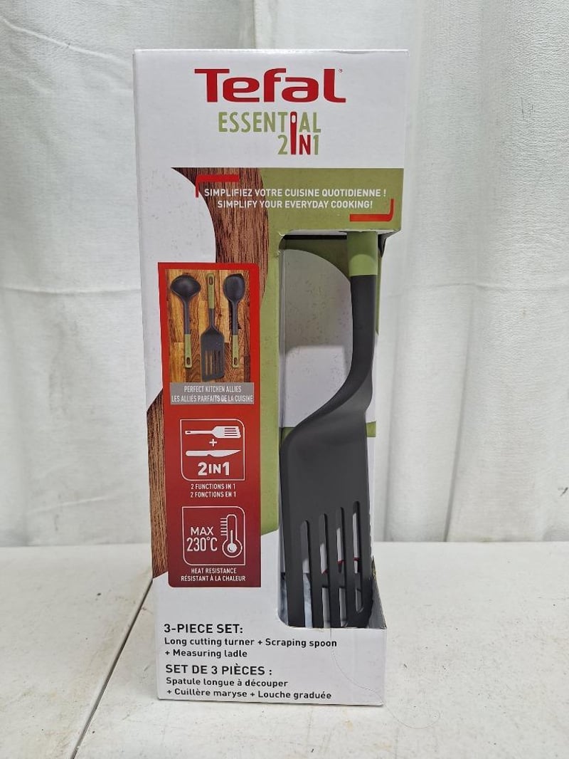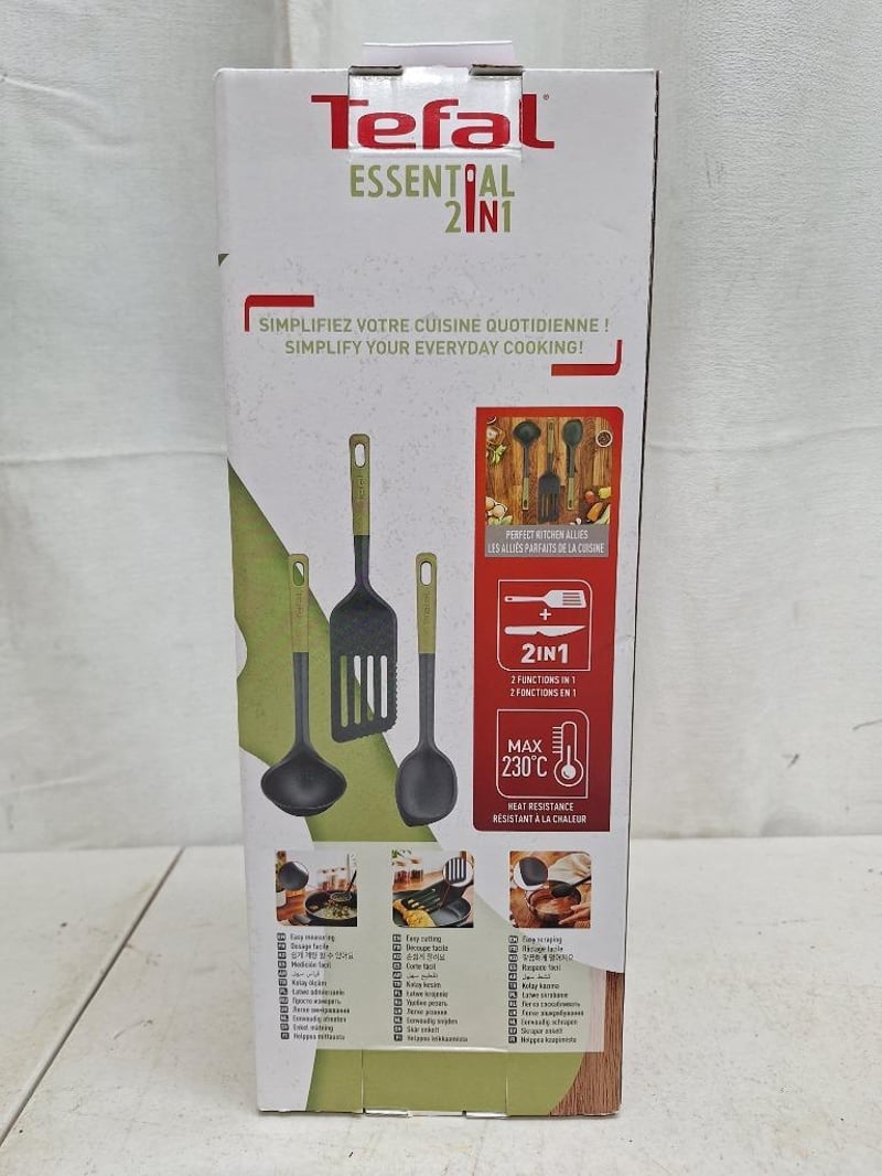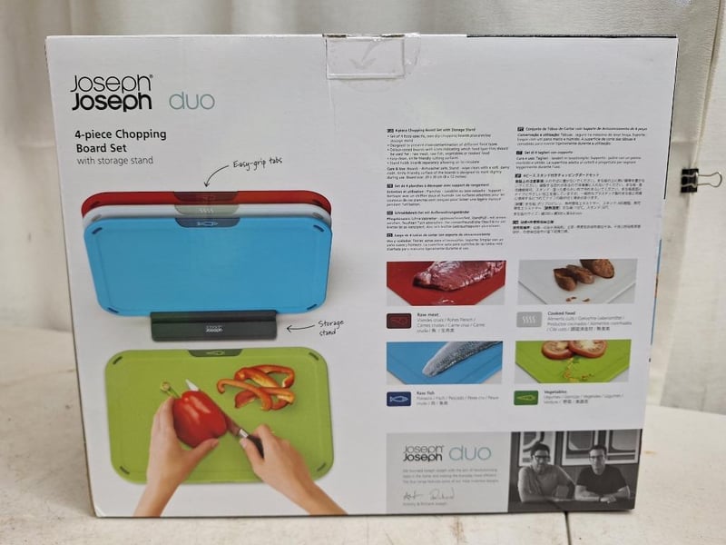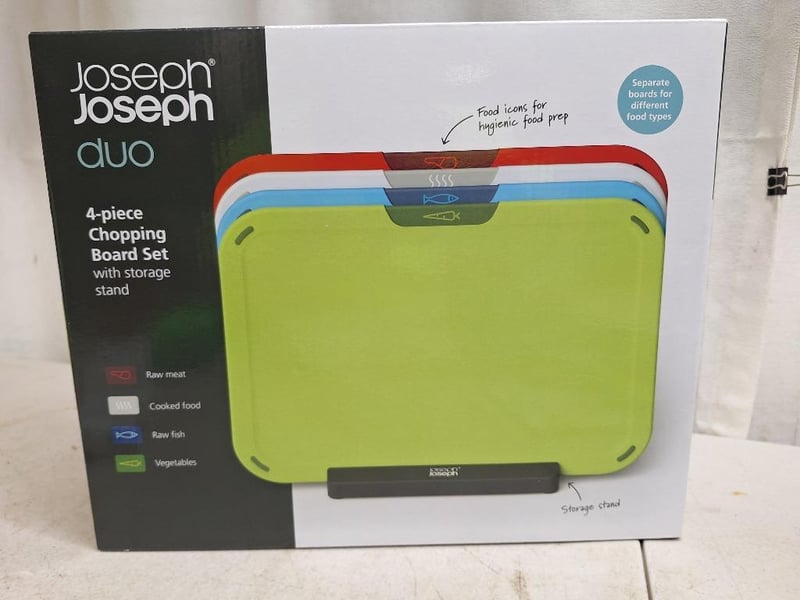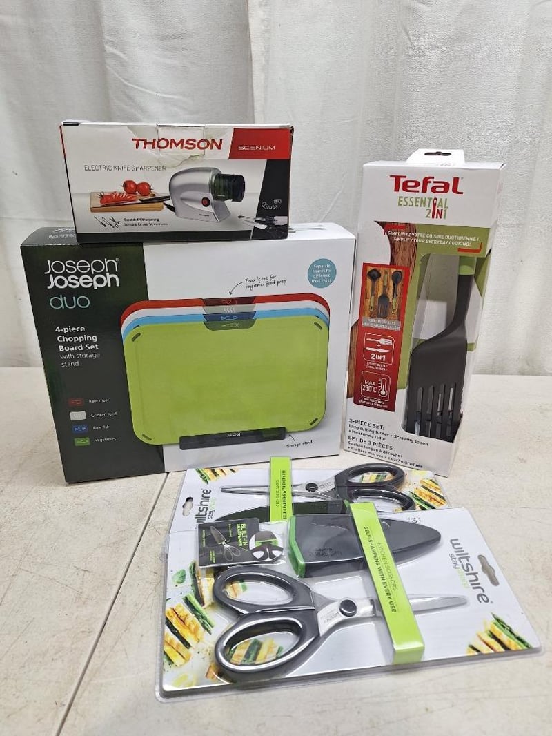 1 x JOSEPH JOSEPH duo 4 piece chopping board, with storage stand, NEW factory sealed in box, 1 x THOMSON electric knife sharpner, NEW factory sealed in box, 1 x TEFAL Essential 2 in 1, 3 -piece set, NEW factory sealed in box, 2 x WILTSHIRE staysharp kitchen scissors, NEW factory sealed in packet