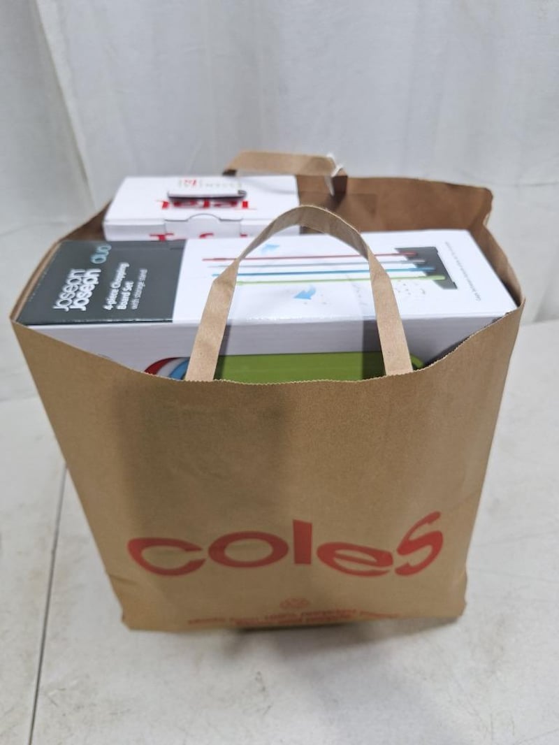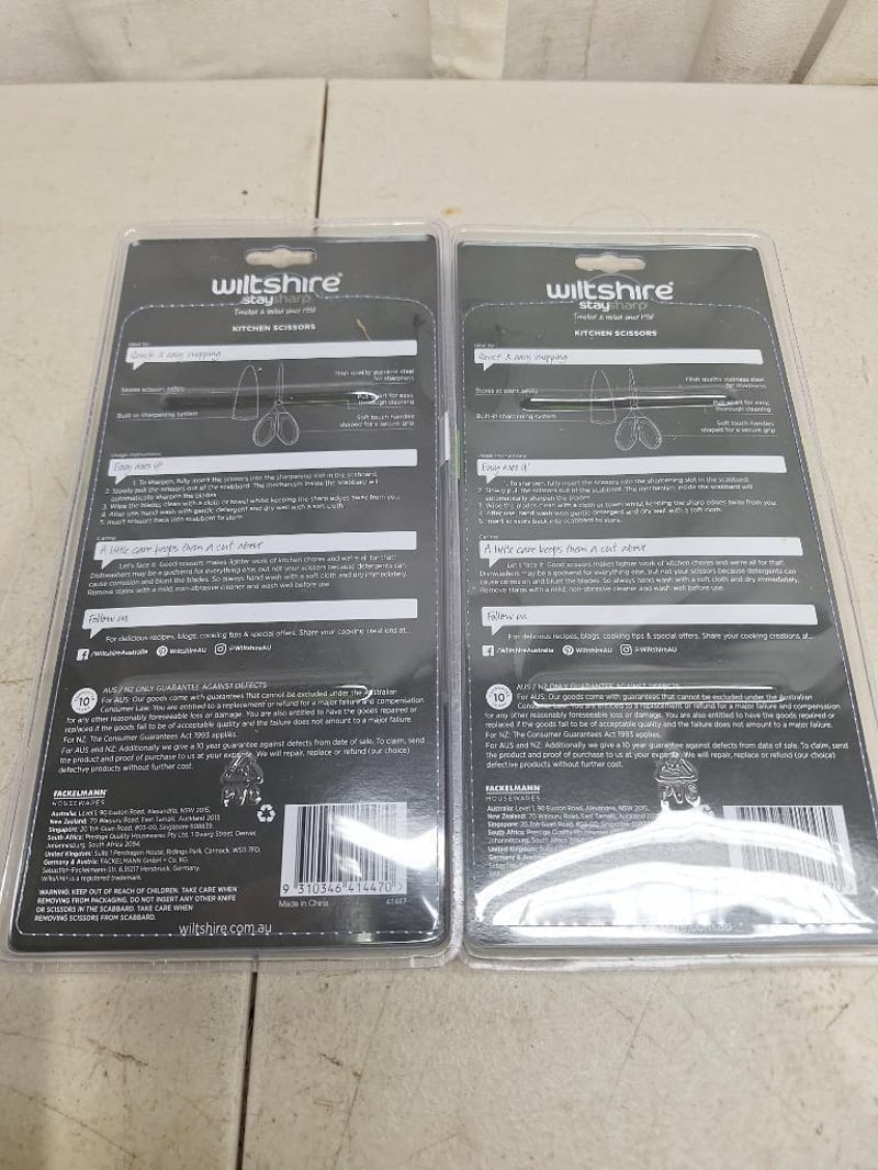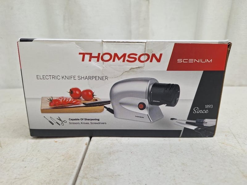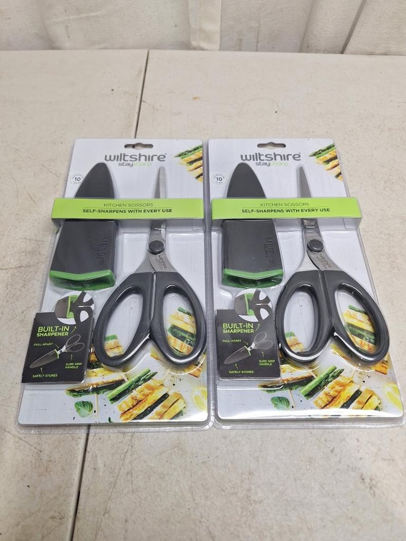 1 x JOSEPH JOSEPH duo 4 piece chopping board, with storage stand, NEW factory sealed in box, 1 x THOMSON electric knife sharpner, NEW factory sealed in box, 1 x TEFAL Essential 2 in 1, 3 -piece set, NEW factory sealed in box, 2 x WILTSHIRE staysharp kitchen scissors, NEW factory sealed in packet