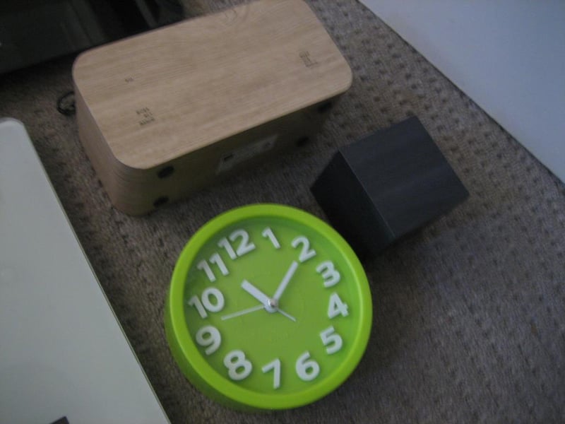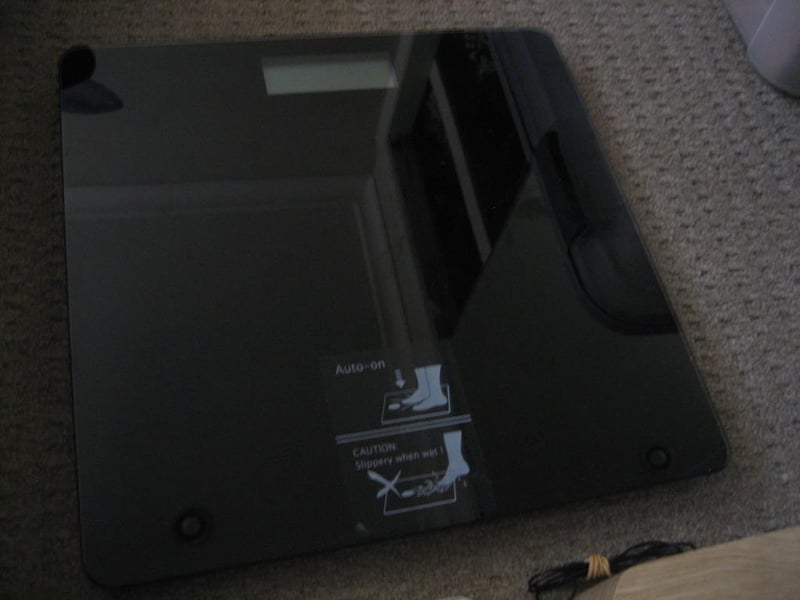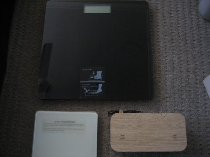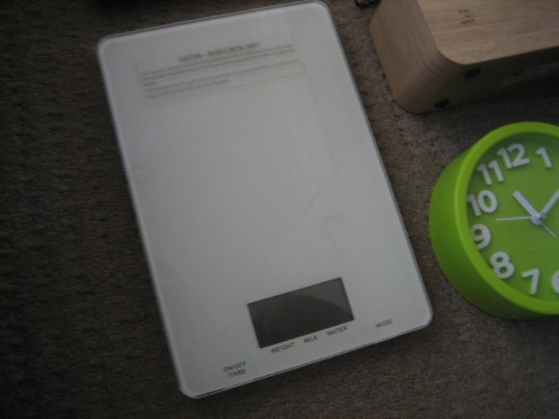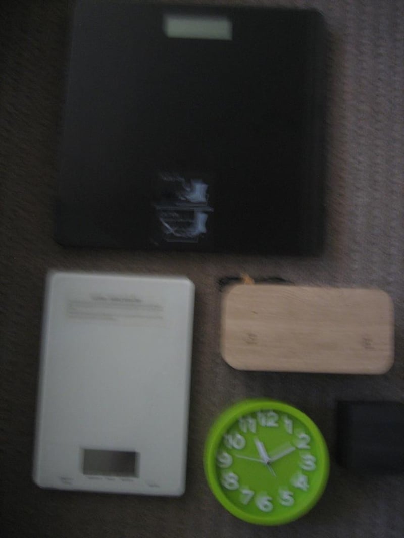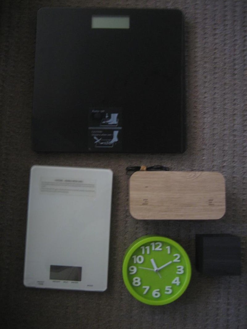 Set of black bathroom and white Kitchen scales, 3x alarm clocks.